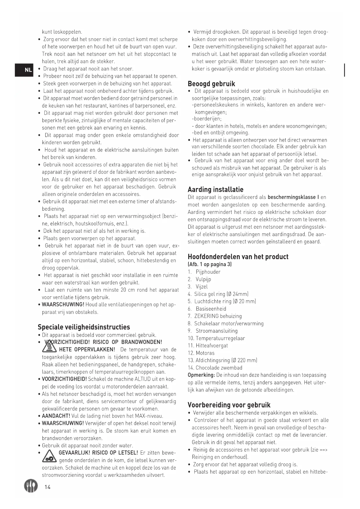 - Het apparaat is alleen ontworpen voor het direct verwarmen van verschillende soorten chocolade. Elk ander gebruik kan leiden tot schade aan het apparaat of persoonlijk letsel.