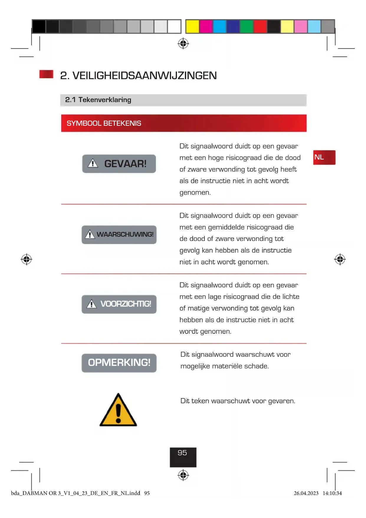 SYMBOOL BETEKENIS GEVAAR! Dit signaalwoord duidt op een gevaar met een hoge risicograad die de dood of zware verwonding tot gevolg heeft als de instructie niet in acht wordt genomen. WAARSCHUWING! Dit signaalwoord duidt op een gevaar met een gemiddelde risicograad die de dood of zware verwonding tot gevolg kan hebben als de instructie niet in acht wordt genomen. VOORZICHTIG! Dit signaalwoord duidt op een gevaar met een lage risicograad die de lichte of matige verwonding tot gevolg kan hebben als de instructie niet in acht wordt genomen. OPMERKING! Dit signaalwoord waarschuwt voor mogelijke materiële schade. Dit teken waarschuwt voor gevaren.