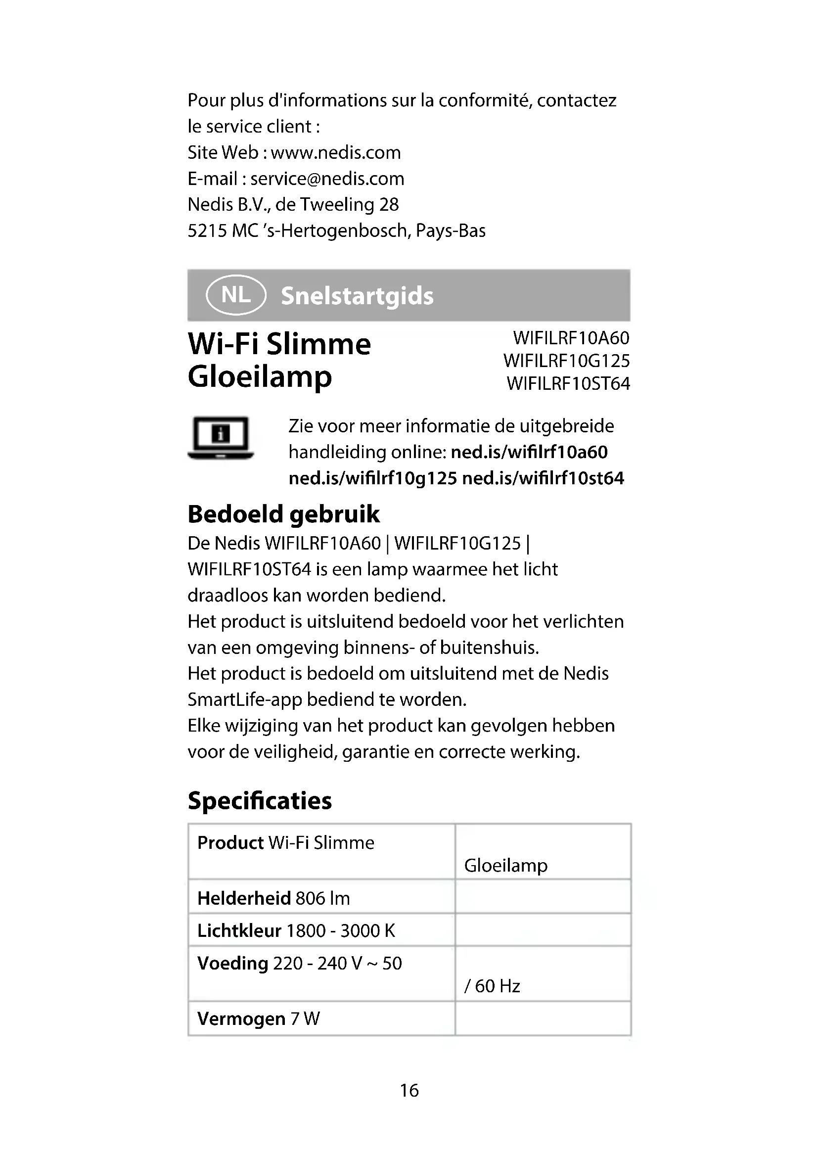 Zie onze ondersteunings-webpagina om alle mogelijkheden van dit Nedis® product te ontdekken. Verklaring van overeenstemming Wij, Nedis B.V. verklaren als fabrikant dat het product WIFILRF10A60 | WIFILRF10G125 | WIFILRF10ST64 van ons merk Nedis®, geproduceerd in China, is getest conform alle relevante CE-normen en voorschriften en dat alle tests met succes zijn doorstaan. Dit omvat, maar is niet beperkt tot de richtlijn RED 2014/53/EU. De volledige conformiteitsverklaring (en het blad met veiligheidsgegevens indien van toepassing) kan worden gevonden en gedownload via nedis.nl/wilrf10a60#support nedis.nl/wilrf10g125#support nedis.nl/wilrf10st64#support Voor andere informatie met betrekking tot de naleving neemt u contact op met de klantenservice: Web: www.nedis.nl Email: service@nedis.com20 Nedis B.V., de Tweeling 28 5215 MC ’s-Hertogenbosch, Nederland