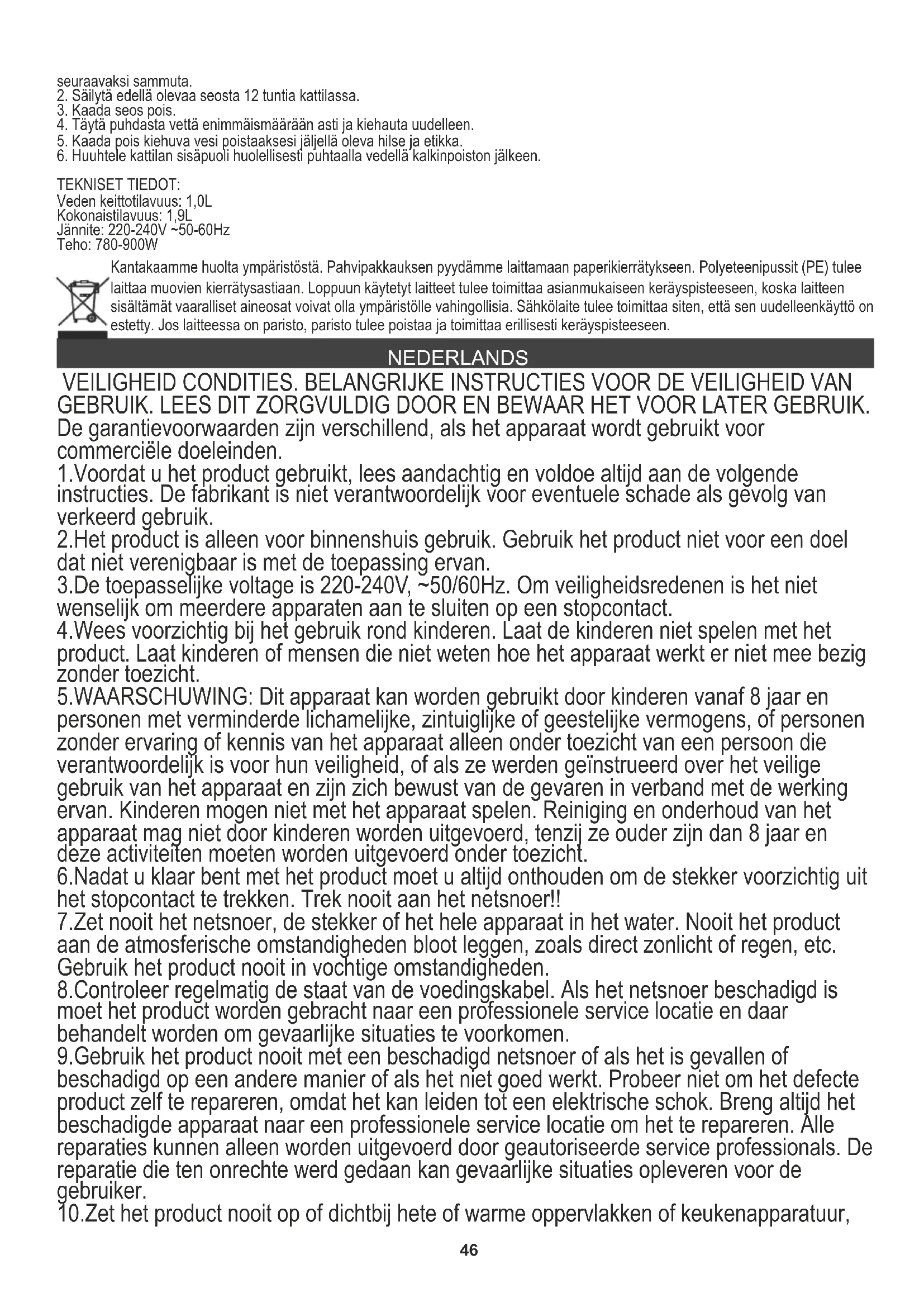 TEKNISET TIEDOT: Veden keittotilavuus: 1,0L Kokonaistilavuus: 1,9L Jännite: 220-240V ~50-60Hz Teho: 780-900W VEILIGHEID CONDITIES. BELANGRIJKE INSTRUCTIES VOOR DE VEILIGHEID VAN GEBRUIK. LEES DIT ZORGVULDIG DOOR EN BEWAAR HET VOOR LATER GEBRUIK. De garantievoorwaarden zijn verschillend, als het apparaat wordt gebruikt voor commerciële doeleinden. 1.Voordat u het product gebruikt, lees aandachtig en voldoe altijd aan de volgende instructies. De fabrikant is niet verantwoordelijk voor eventuele schade als gevolg van verkeerd gebruik. 2.Het product is alleen voor binnenshuis gebruik. Gebruik het product niet voor een doel dat niet verenigbaar is met de toepassing ervan. 3.De toepasselijke voltage is 220-240V, ~50/60Hz. Om veiligheidsredenen is het niet wenselijk om meerdere apparaten aan te sluiten op een stopcontact. 4.Wees voorzichtig bij het gebruik rond kinderen. Laat de kinderen niet spelen met het product. Laat kinderen of mensen die niet weten hoe het apparaat werkt er niet mee bezig zonder toezicht. 5.WAARSCHUWING: Dit apparaat kan worden gebruikt door kinderen vanaf 8 jaar en personen met verminderde lichamelijke, zintuiglijke of geestelijke vermogens, of personen zonder ervaring of kennis van het apparaat alleen onder toezicht van een persoon die verantwoordelijk is voor hun veiligheid, of als ze werden geïnstrueerd over het veilige gebruik van het apparaat en zijn zich bewust van de gevaren in verband met de werking ervan. Kinderen mogen niet met het apparaat spelen. Reiniging en onderhoud van het apparaat mag niet door kinderen worden uitgevoerd, tenzij ze ouder zijn dan 8 jaar en deze activiteiten moeten worden uitgevoerd onder toezicht. 6.Nadat u klaar bent met het product moet u altijd onthouden om de stekker voorzichtig uit het stopcontact te trekken. Trek nooit aan het netsnoer!! 7.Zet nooit het netsnoer, de stekker of het hele apparaat in het water. Nooit het product aan de atmosferische omstandigheden bloot leggen, zoals direct zonlicht of regen, etc. Gebruik het product nooit in vochtige omstandigheden. 8.Controleer regelmatig de staat van de voedingskabel. Als het netsnoer beschadigd is moet het product worden gebracht naar een professionele service locatie en daar behandelt worden om gevaarlijke situaties te voorkomen. 9.Gebruik het product nooit met een beschadigd netsnoer of als het is gevallen of beschadigd op een andere manier of als het niet goed werkt. Probeer niet om het defecte product zelf te repareren, omdat het kan leiden tot een elektrische schok. Breng altijd het beschadigde apparaat naar een professionele service locatie om het te repareren. Alle reparaties kunnen alleen worden uitgevoerd door geautoriseerde service professionals. De reparatie die ten onrechte werd gedaan kan gevaarlijke situaties opleveren voor de gebruiker. 10.Zet het product nooit op of dichtbij hete of warme oppervlakken of keukenapparatuur,47 zoals de elektrische oven of gasbrander. 11.Gebruik het product nooit in de buurt van brandbare stoffen. 12.Laat het snoer niet over de rand van het aanrecht hangen of in aanraking komen met hete oppervlakken. Trek niet met kracht aan het netsnoer, omdat dit het netsnoer zal beschadigen en tot elektrische schokken kan leiden. 13.Laat het product nooit zonder toezicht aangesloten op de stroombron. Zelfs als het gebruik voor een korte tijd wordt onderbroken, schakel het dan uit van het netwerk, haal de stekker uit het stopcontact.