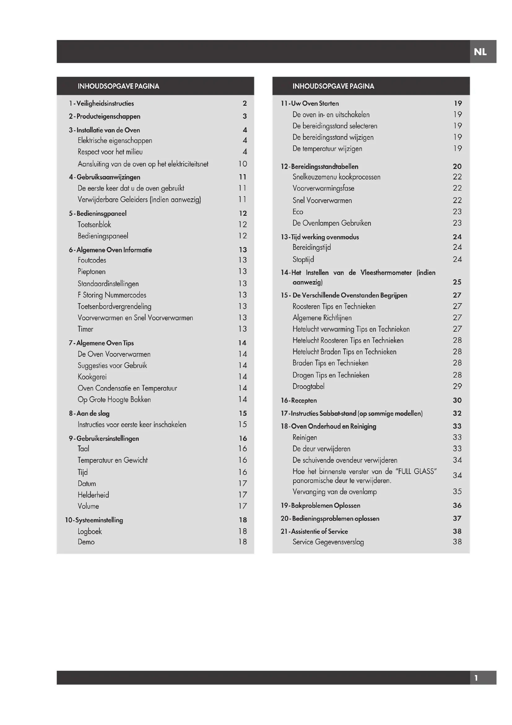 Verwijder voor het eerste gebruik van de oven alle verpakking en vreemde materialen van de oven(s). Als dit materiaal niet wordt verwijderd uit de binnenkant van de oven, kan het smelten of verbranden als het apparaat wordt gebruikt. Foutcodes Deze code verschijnt in het geval dat de elektronische besturing een storing aangeeft. De huidige functie wordt geblokkeerd wanneer deze code verschijnt. Als het type fout betrekking heeft op een veiligheidsfunctie wordt de oven onbruikbaar en verschijnt dezelfde foutcode iedere keer dat er een startpoging wordt gedaan (bel de after-sales service in dit geval). Heeft de fout betrekking op een kleine storing, dan kan de oven bij opnieuw starten gebruikt worden voor alle functies die geen betrekking hebben op het defecte onderdeel (bijv. een verwarmingselement). Pieptonen Bevestigt dat de opdracht is ontvangen nadat een toets is ingedrukt. Het geeft ook aan dat een tijdfunctie voltooid is (bijv. Timer of Kookwekker). Een akoestisch signaal waarschuwt de gebruiker, tijdens het bereiden van een gerecht, dat de oven wacht op bediening van de gebruiker (bijv. plaats het gerecht of draai het om). Pieptonen signaleren ook een ovenstoring. Standaardinstellingen De bereidingsstanden selecteren automatisch een geschikte temperatuur als de bereidingswijze is geselecteerd, deze kan aangepast worden wanneer een andere temperatuur vereist is. F Storing Nummercodes Deze codes worden getoond als de elektrische besturing een probleem detecteert in de oven of in de elektronica. De foutcode wordt vastgelegd in het foutenlogboek in het Instellingenmenu. Deze fout kan worden meegedeeld aan de monteur, zodat hij/zij de mogelijke oorzaak van het probleem op voorhand kan begrijpen. Toetsenbordvergrendeling Houd toets 3 seconden ingedrukt. De bedieningselementen zijn nu geblokkeerd en er verschijnt een “Sleutelpictogram”. Herhaal dezelfde handeling voor nog eens 3 seconden om het toetsenbord te ontgrendelen. OPMERKING: De functie uitschakeling is altijd beschikbaar. Voorverwarmen en Snel Voorverwarmen Als er een bereidingsfunctie is ingesteld en de oven aan het opwarmen is, start het voorverwarmen, tijdens deze periode wordt de momentane temperatuur weergegeven samen met het thermometer symbool. Zodra de 100% is bereikt, klinkt er een ‘einde van de voorverwarming’ toon en verdwijnt de actuele temperatuurwaarde. Er is een Snel Voorverwarmen functie aanwezig voor als het nodig is de oven snel op te warmen: het gebruikt de verwarmingselementen en de heteluchtventilator op een speciale manier om de verwarmingstijd zoveel mogelijk in te korten. Na een van de bereidingsfuncties te hebben ingesteld waarvoor snel voorwarmen beschikbaar is, dient de gewenste temperatuurwaarde te worden ingesteld door op de toets te drukken, selecteer in het functie menu het pictogram met de toetsen en bevestig met