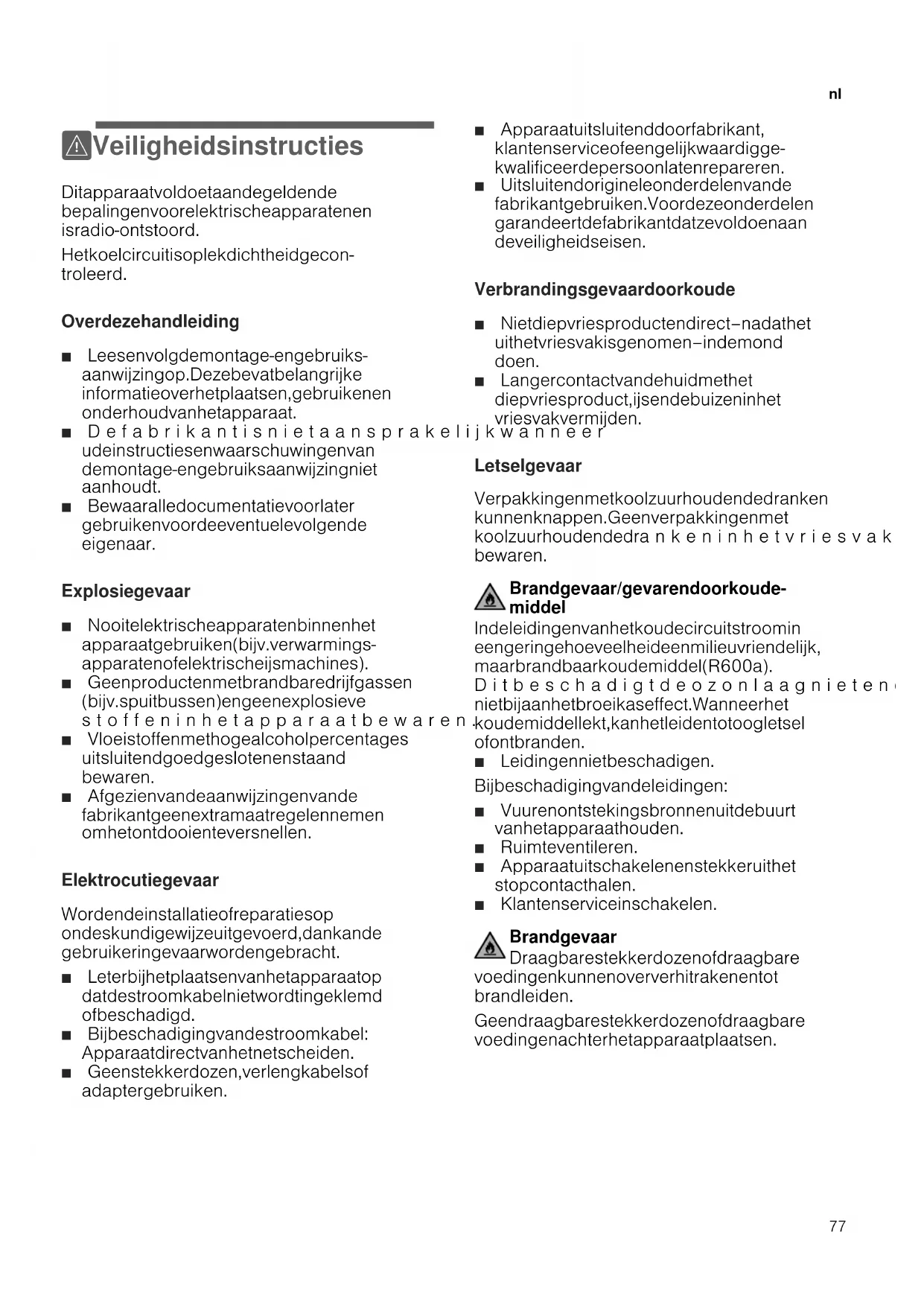 ( Veiligheidsinstructies Dit apparaat voldoet aan de geldende bepalingen voor elektrische apparaten en is radio-ontstoord. Het koelcircuit is op lekdichtheid gecon troleerd. Over deze handleiding Ø Lees en volg de montage- en gebruiks aanwijzing op. Deze bevat belangrijke informatie over het plaatsen, gebruiken en onderhoud van het apparaat. Ø Defabrikantisnietaansprakelijkwanneer u de instructies en waarschuwingen van de montage- en gebruiksaanwijzing niet aanhoudt. Ø Bewaar alle documentatie voor later gebruik en voor de eventuele volgende eigenaar. Explosiegevaar Ø Nooit elektrische apparaten binnen het apparaat gebruiken (bijv. verwarmings apparaten of elektrische ijsmachines). Ø Geen producten met brandbare drijfgassen (bijv. spuitbussen) en geen explosieve stoffeninhetapparaatbewaren. Ø Vloeistoffen met hoge alcoholpercentages uitsluitend goed gesloten en staand bewaren. Ø Afgezien van de aanwijzingen van de fabrikant geen extra maatregelen nemen om het ontdooien te versnellen. Elektrocutiegevaar Worden de installatie of reparaties op ondeskundige wijze uitgevoerd, dan kan de gebruiker in gevaar worden gebracht. Ø Let er bij het plaatsen van het apparaat op dat de stroomkabel niet wordt ingeklemd of beschadigd. Ø Bij beschadiging van de stroomkabel: Apparaat direct van het net scheiden. Ø Geen stekkerdozen, verlengkabels of adapter gebruiken. Ø Apparaat uitsluitend door fabrikant, klantenservice of een gelijkwaardig ge kwalificeerde persoon laten repareren. Ø Uitsluitend originele onderdelen van de fabrikant gebruiken. Voor deze onderdelen garandeert de fabrikant dat ze voldoen a an de veiligheidseisen. Verbrandingsgevaar door koude Ø Niet diepvriesproducten direct – nadat het uit het vriesvak is genomen – in de mond doen. Ø Langer contact van de huid met het diepvriesproduct, ijs en de buizen in het vriesvak vermijden. Letselgevaar Verpakkingen met koolzuurhoudende dranken kunnen knappen. Geen verpakkingen met koolzuurhoudende drankeninhetvriesvak bewaren. Brandgevaar / gevaren door koude middel In de leidingen van het koudecircuit stroom in een geringe hoeveelheid een milieuvriendelijk, maar brandbaar koudemiddel (R600a). Ditbeschadigtdeozonlaagnietendraagt niet bij aan het broeikaseffect. Wanneer het koudemiddel lekt, kan het leiden tot oogletsel of ontbranden. Ø Leidingen niet beschadigen. Bij beschadiging van de leidingen : Ø Vuur en ontstekingsbronnen uit de buurt van het apparaat houden. Ø Ruimte ventileren. Ø Apparaat uitschakelen en stekker uit het stopcontact halen. Ø Klantenservice inschakelen. Brandgevaar Draagbare stekkerdozen of draagbare voedingen kunnen oververhit raken en tot brand leiden. Geen draagbare stekkerdozen of draagbare voedingen achter het apparaat plaatsen.nl
