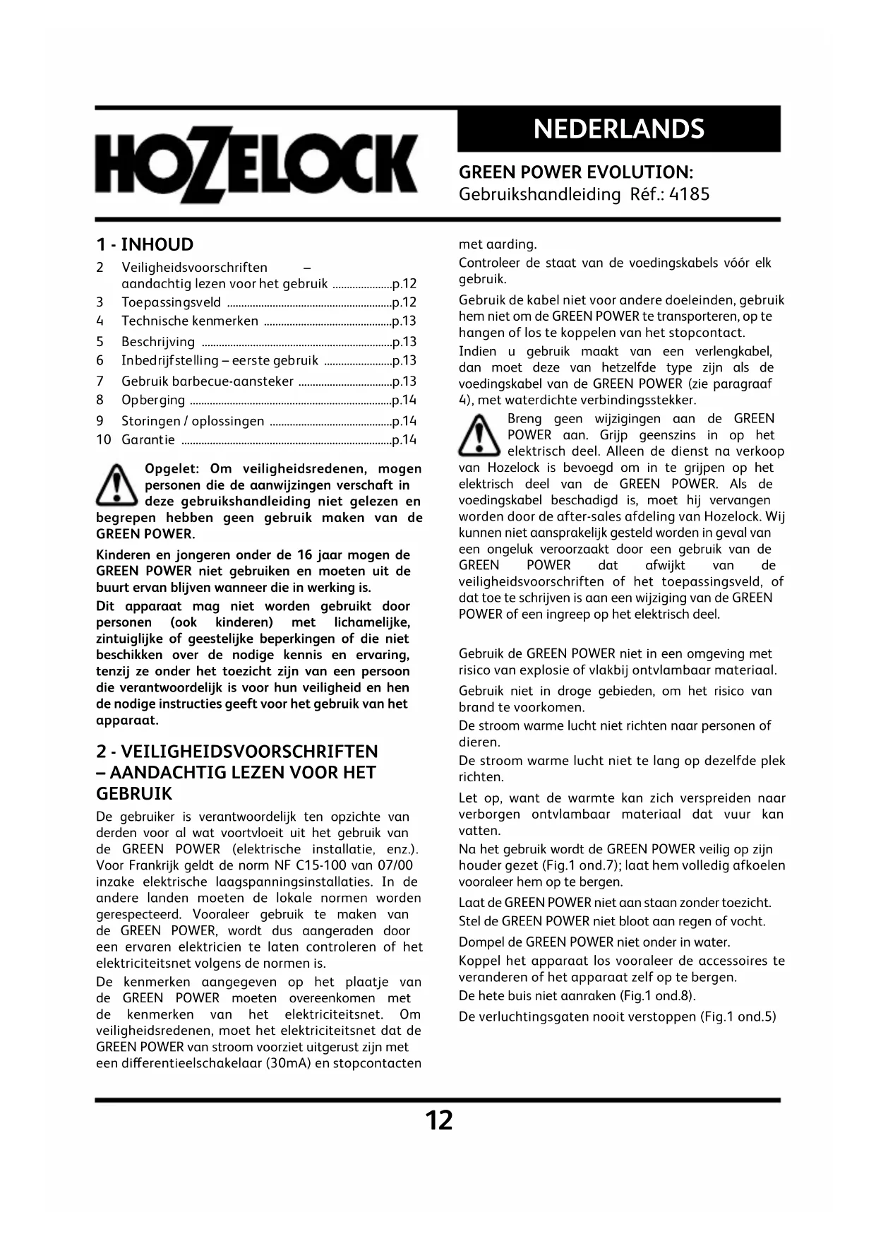 2 Veiligheidsvoorschriften – aandachtig lezen voor het gebruik .....................p.12 3 Toepassingsveld ..........................................................p.12 4 Technische kenmerken .............................................p.13 5 Beschrijving ...................................................................p.13 6 Inbedrijfstelling – eerste gebruik ........................p.13 7 Gebruik barbecue-aansteker .................................p.13 8 Opberging .......................................................................p.14 9 Storingen / oplossingen ...........................................p.14 10 Garantie ..........................................................................p.14 Opgelet: Om veiligheidsredenen, mogen personen die de aanwijzingen verschaft in deze gebruikshandleiding niet gelezen en begrepen hebben geen gebruik maken van de GREEN POWER. Kinderen en jongeren onder de 16 jaar mogen de GREEN POWER niet gebruiken en moeten uit de buurt ervan blijven wanneer die in werking is. Dit apparaat mag niet worden gebruikt door personen (ook kinderen) met lichamelijke, zintuiglijke of geestelijke beperkingen of die niet beschikken over de nodige kennis en ervaring, tenzij ze onder het toezicht zijn van een persoon die verantwoordelijk is voor hun veiligheid en hen de nodige instructies geeft voor het gebruik van het apparaat.