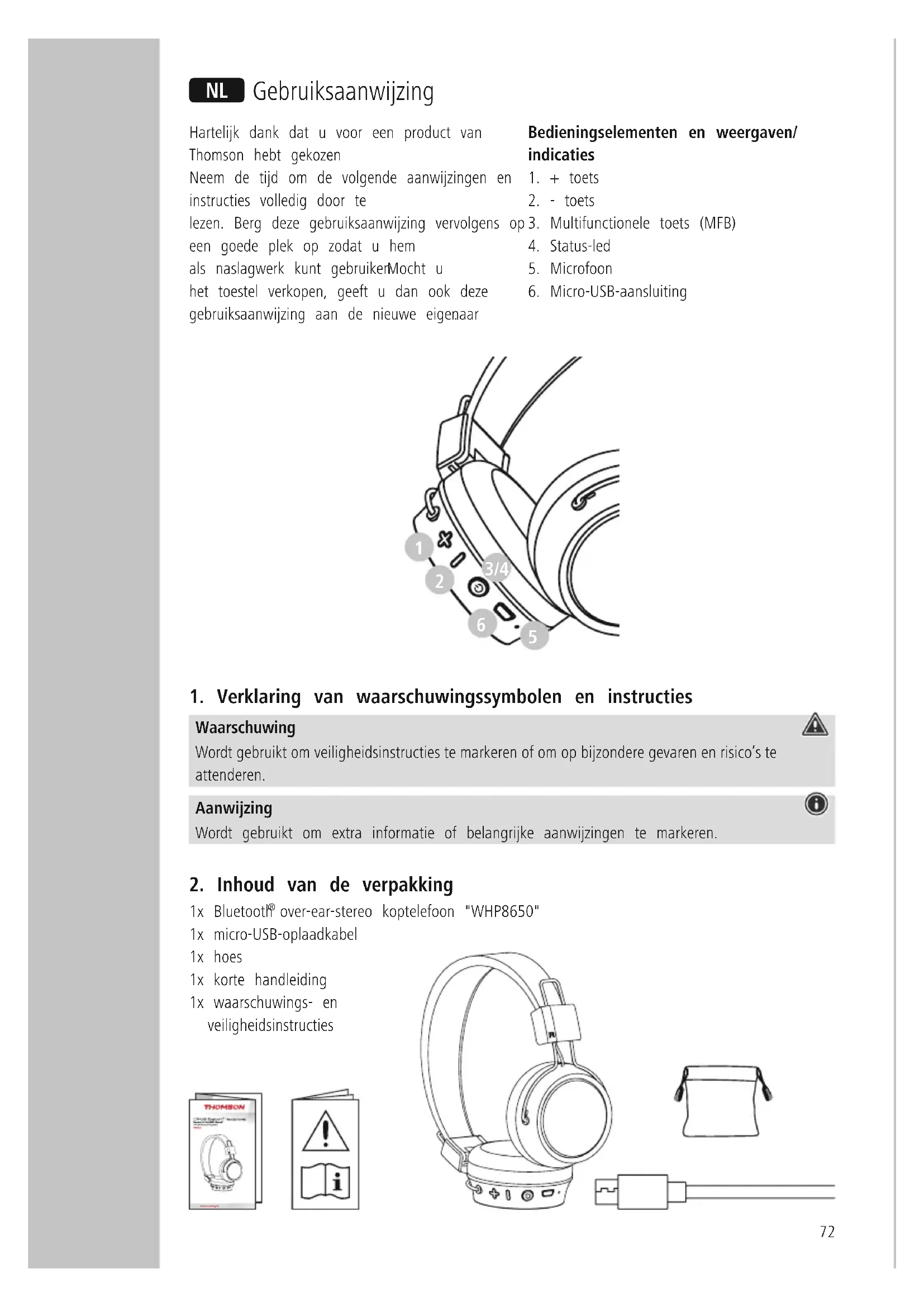 over-ear-stereo koptelefoon "WHP8650" 1x micro-USB-oplaadkabel 1x hoes 1x korte handleiding 1x waarschuwings- en veiligheidsinstructies N Gebruiksaanwijzing