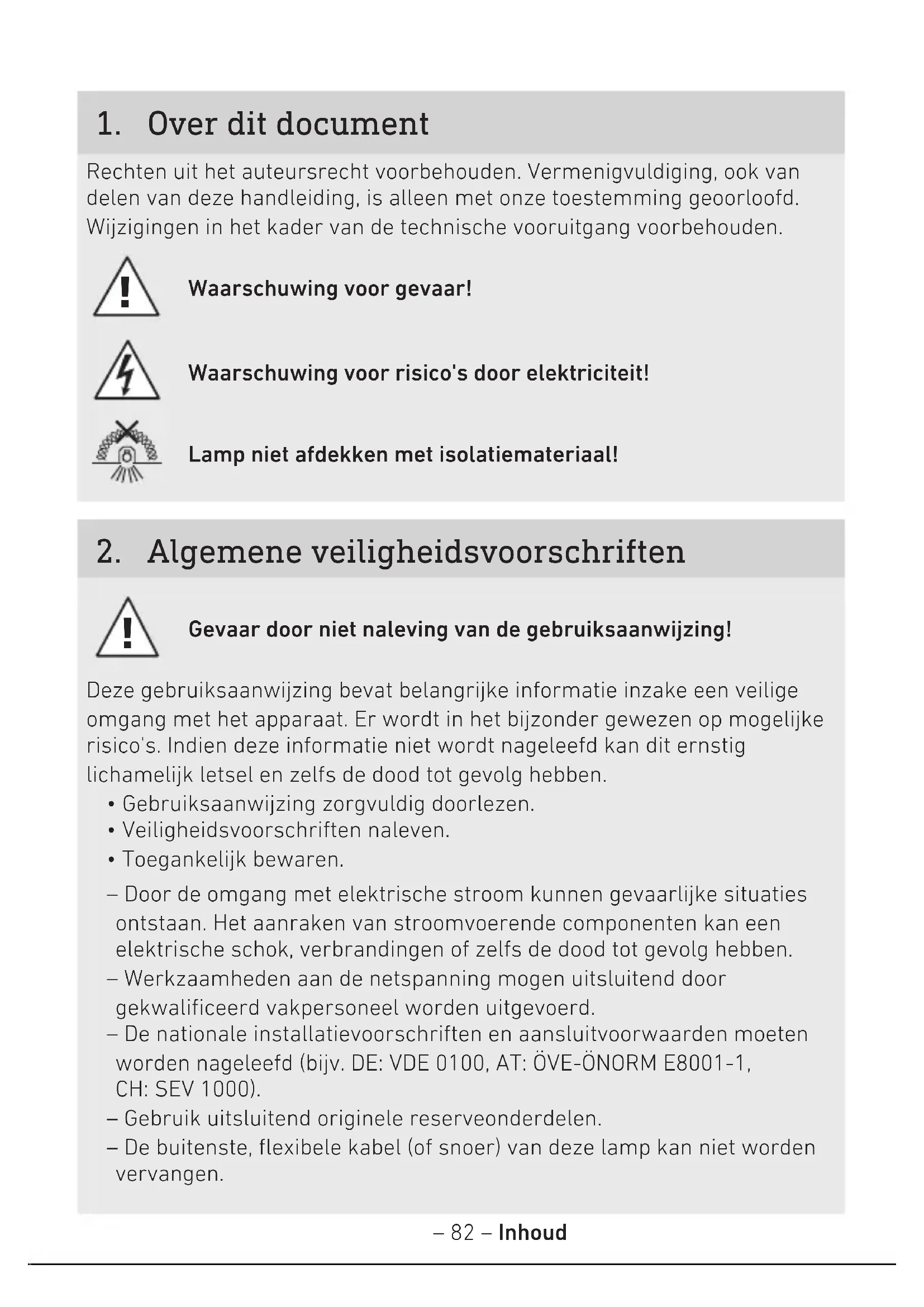 - Toegankelijk bewaren. – Door de omgang met elektrische stroom kunnen gevaarlijke situaties ontstaan. Het aanraken van stroomvoerende componenten kan een elektrische schok, verbrandingen of zelfs de dood tot gevolg hebben. – Werkzaamheden aan de netspanning mogen uitsluitend door gekwalificeerd vakpersoneel worden uitgevoerd. – De nationale installatievoorschriften en aansluitvoorwaarden moeten worden nageleefd (bijv. DE: VDE0100, AT:ÖVE-ÖNORM E8001-1, CH:SEV1000). – Gebruik uitsluitend originele reserveonderdelen. – De buitenste, flexibele kabel (of snoer) van deze lamp kan niet worden vervangen.– 83 – Inhoud