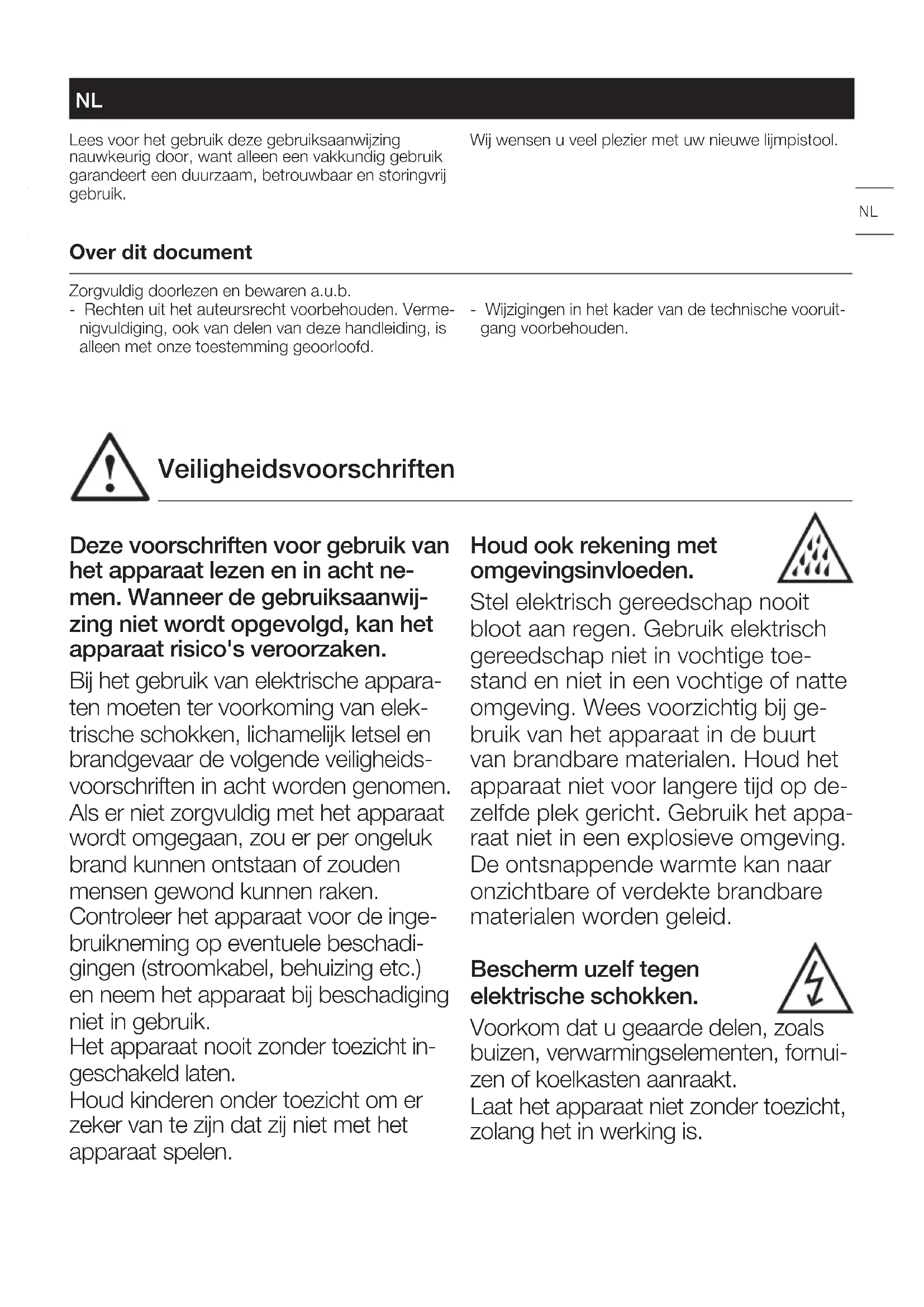 Veiligheidsvoorschriften Lees voor het gebruik deze gebruiksaanwijzing nauwkeurig door, want alleen een vakkundig gebruik garandeert een duurzaam, betrouwbaar en storingvrij gebruik. Wij wensen u veel plezier met uw nieuwe lijmpistool. NLOriginele gebruiksaanwijzing Over dit document Zorgvuldig doorlezen en bewaren a.u.b. - Rechten uit het auteursrecht voorbehouden. Verme- nigvuldiging, ook van delen van deze handleiding, is alleen met onze toestemming geoorloofd. - Wijzigingen in het kader van de technische vooruit- gang voorbehouden. Deze voorschriften voor gebruik van het apparaat lezen en in acht ne- men. Wanneer de gebruiksaanwij- zing niet wordt opgevolgd, kan het apparaat risico's veroorzaken. Bij het gebruik van elektrische appara- ten moeten ter voorkoming van elek- trische schokken, lichamelijk letsel en brandgevaar de volgende veiligheids- voorschriften in acht worden genomen. Als er niet zorgvuldig met het apparaat wordt omgegaan, zou er per ongeluk brand kunnen ontstaan of zouden mensen gewond kunnen raken. Controleer het apparaat voor de inge- bruikneming op eventuele beschadi- gingen (stroomkabel, behuizing etc.) en neem het apparaat bij beschadiging niet in gebruik. Het apparaat nooit zonder toezicht in- geschakeld laten. Houd kinderen onder toezicht om er zeker van te zijn dat zij niet met het apparaat spelen. Houd ook rekening met omgevingsinvloeden. Stel elektrisch gereedschap nooit bloot aan regen. Gebruik elektrisch gereedschap niet in vochtige toe- stand en niet in een vochtige of natte omgeving. Wees voorzichtig bij ge- bruik van het apparaat in de buurt van brandbare materialen. Houd het apparaat niet voor langere tijd op de- zelfde plek gericht. Gebruik het appa- raat niet in een explosieve omgeving. De ontsnappende warmte kan naar onzichtbare of verdekte brandbare materialen worden geleid. Bescherm uzelf tegen elektrische schokken. Voorkom dat u geaarde delen, zoals buizen, verwarmingselementen, fornui- zen of koelkasten aanraakt. Laat het apparaat niet zonder toezicht, zolang het in werking is.