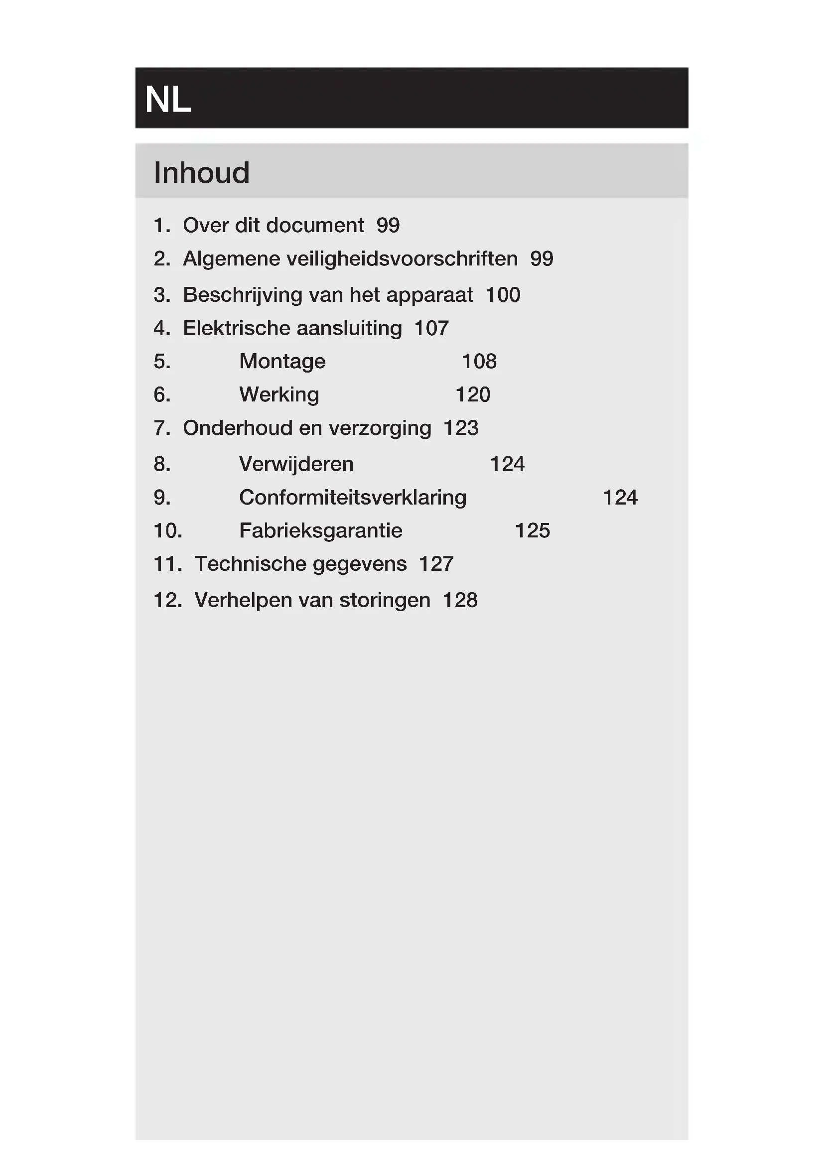 - Reinig het apparaat met een licht vochtige doek zonder reinigingsmiddel. Belangrijk: de regelaar kan niet worden vervangen.– 124 – Inhoud