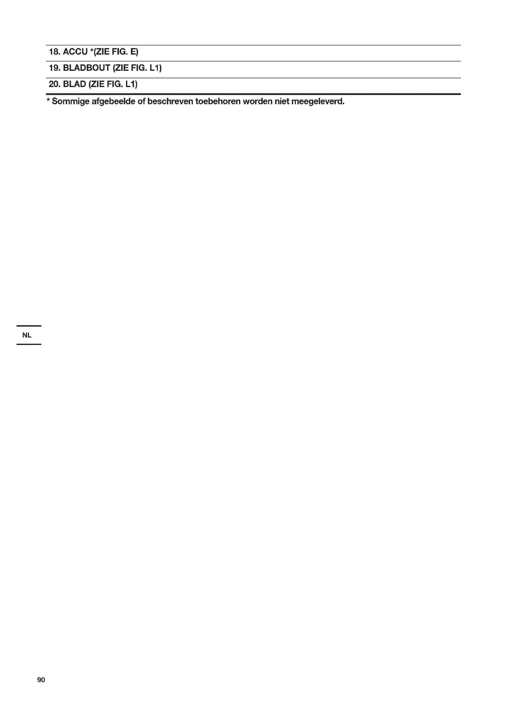 K-1 K-2 K-3 ONDERHOUD VAN HET MES (Zie Fig. L1, L2) Vernieuw het metalen mes na 50 uur maaien met een minimum vanaf 2 jaar, ongeacht de conditie waarin het mes verkeert. Volg deze werkwijze voor het verwijderen en vervangen van het mes. Draag tuinhandschoenen (niet meegeleverd) en gebruik een moersleutel (niet meegeleverd) om het mes te verwijderen. Houd het mes (20) vast en schroef de bout (19) linksom met de moersleutel, en verwijder vervolgens het blad. Om opnieuw te monteren, plaatst u het blad (20) met de snijranden naar de grond gericht. Zet daarna de moer stevig vast (19).