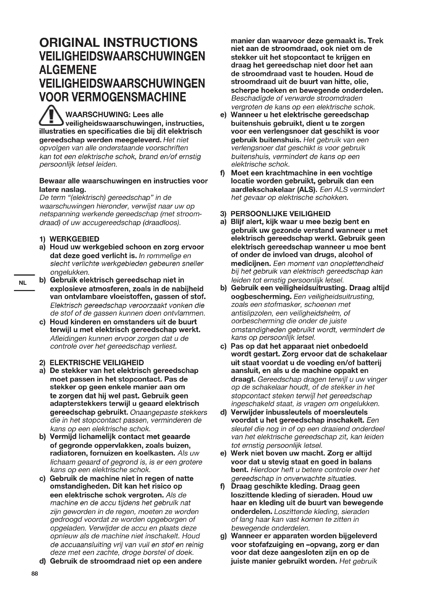 ORIGINAL INSTRUCTIONS VEILIGHEIDSWAARSCHUWINGEN ALGEMENE VEILIGHEIDSWAARSCHUWINGEN VOOR VERMOGENSMACHINE WAARSCHUWING: Lees alle veiligheidswaarschuwingen, instructies, illustraties en specificaties die bij dit elektrisch gereedschap werden meegeleverd. Het niet opvolgen van alle onderstaande voorschriften kan tot een elektrische schok, brand en/of ernstig persoonlijk letsel leiden. Bewaar alle waarschuwingen en instructies voor latere naslag. De term “(elektrisch) gereedschap” in de waarschuwingen hieronder, verwijst naar uw op netspanning werkende gereedschap (met stroom