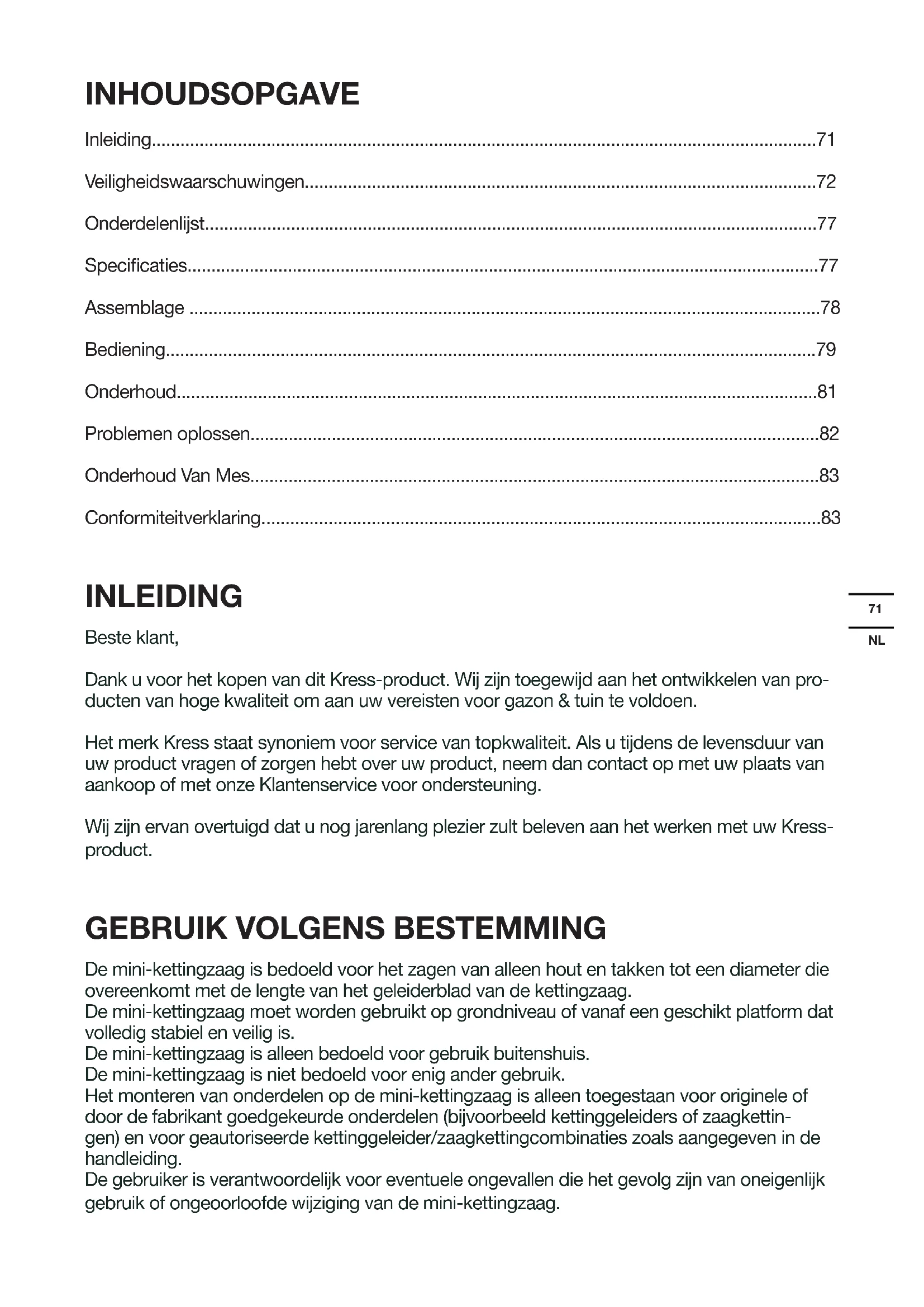 De mini-kettingzaag is bedoeld voor het zagen van alleen hout en takken tot een diameter die overeenkomt met de lengte van het geleiderblad van de kettingzaag. De mini-kettingzaag moet worden gebruikt op grondniveau of vanaf een geschikt platform dat volledig stabiel en veilig is. De mini-kettingzaag is alleen bedoeld voor gebruik buitenshuis. De mini-kettingzaag is niet bedoeld voor enig ander gebruik. Het monteren van onderdelen op de mini-kettingzaag is alleen toegestaan voor originele of door de fabrikant goedgekeurde onderdelen (bijvoorbeeld kettinggeleiders of zaagkettin- gen) en voor geautoriseerde kettinggeleider/zaagkettingcombinaties zoals aangegeven in de handleiding. De gebruiker is verantwoordelijk voor eventuele ongevallen die het gevolg zijn van oneigenlijk gebruik of ongeoorloofde wijziging van de mini-kettingzaag.72