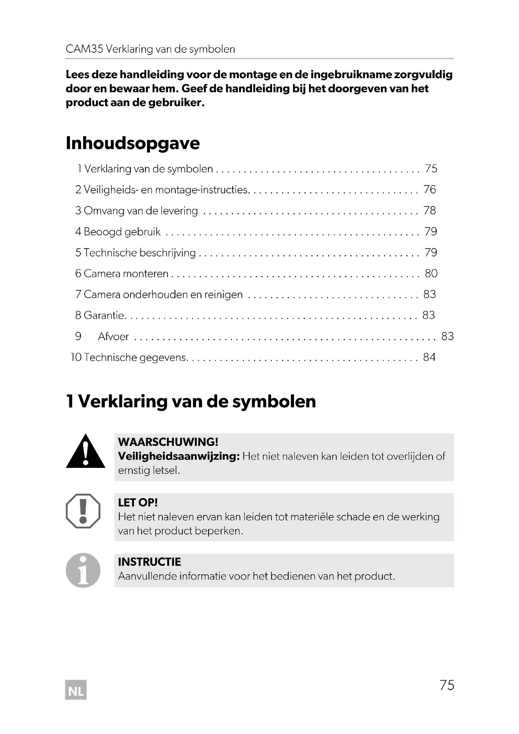 WAARSCHUWING! Veiligheidsaanwijzing: Het niet naleven kan leiden tot overlijden of ernstig letsel. LET OP! Het niet naleven ervan kan leiden tot materiële schade en de werking van het product beperken. INSTRUCTIE Aanvullende informatie voor het bedienen van het product. CAM35-IO-16s.book Seite 75 Dienstag, 21. Februar 2017 5:31 17NL Veiligheids- en montage-instructies CAM35