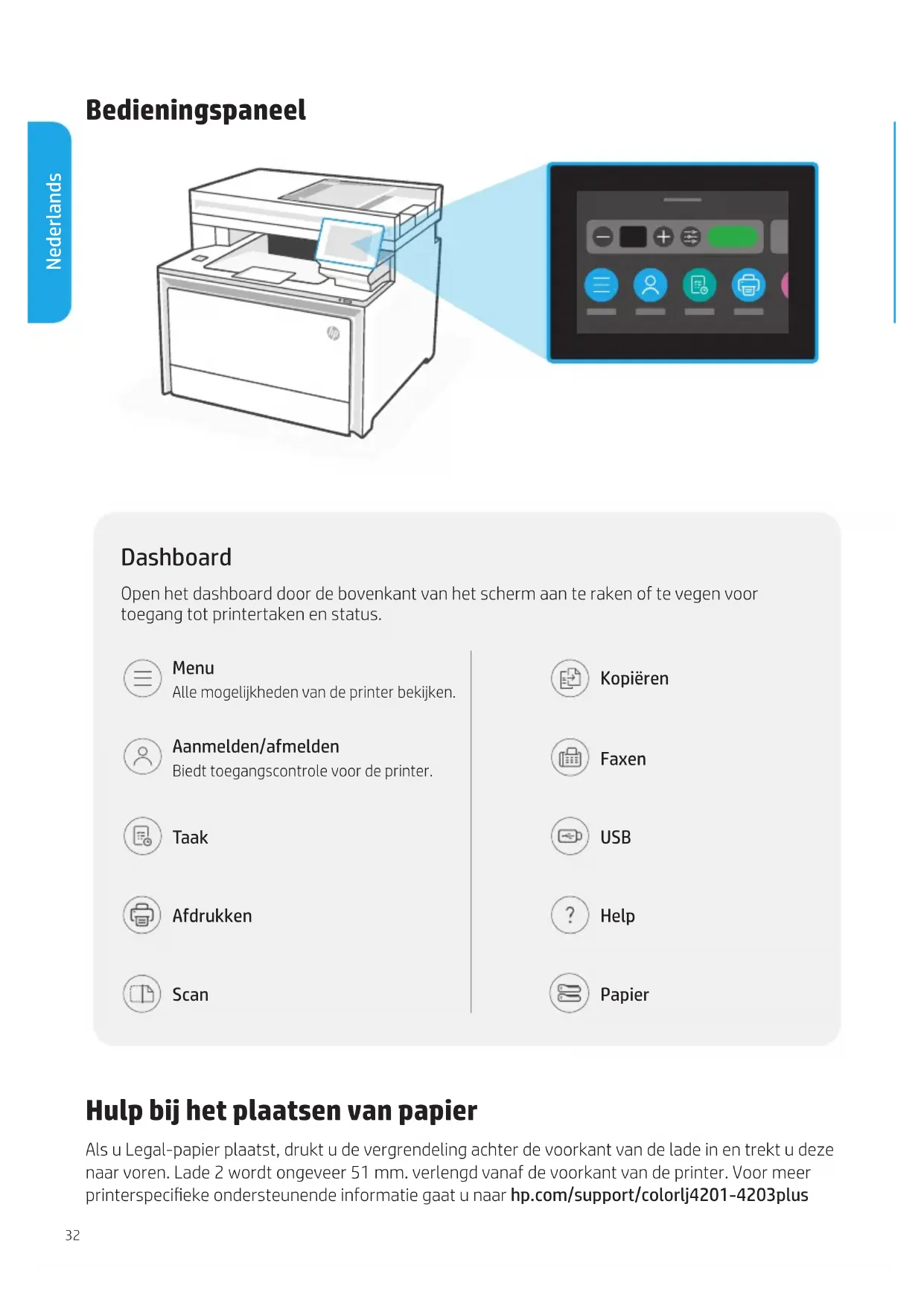 ogprøv at oprette forbindelse igen. https://www.hp.com/support/ colorljmfp4301-4303 Hjælp og support Find oplysninger om fejlnding og diverse videoer på siden for HP’s kundesupport. Oplysningerne i dette dokument kan ændres uden forudgående varsel.32 Bedieningspaneel Hulp bij het plaatsen van papier Als u Legal-papier plaatst, drukt u de vergrendeling achter de voorkant van de lade in en trekt u deze naar voren. Lade 2 wordt ongeveer 51 mm. verlengd vanaf de voorkant van de printer. Voor meer printerspecieke ondersteunende informatie gaat u naar hp.com/support/colorlj4201-4203plus Dashboard Open het dashboard door de bovenkant van het scherm aan te raken of te vegen voor toegang tot printertaken en status. Menu Alle mogelijkheden van de printer bekijken. Aanmelden/afmelden Biedt toegangscontrole voor de printer. Taak Afdrukken Scan Kopiëren Faxen USB Help Papier Nederlands33 Functies van de printer