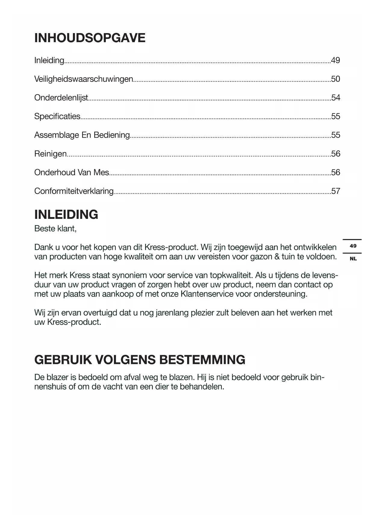 - Conformiteitverklaring INLEIDING Beste klant, Dank u voor het kopen van dit Kress-product. Wij zijn toegewijd aan het ontwikkelen van producten van hoge kwaliteit om aan uw vereisten voor gazon & tuin te voldoen. Het merk Kress staat synoniem voor service van topkwaliteit. Als u tijdens de levens- duur van uw product vragen of zorgen hebt over uw product, neem dan contact op met uw plaats van aankoop of met onze Klantenservice voor ondersteuning. Wij zijn ervan overtuigd dat u nog jarenlang plezier zult beleven aan het werken met uw Kress-product. p. 57