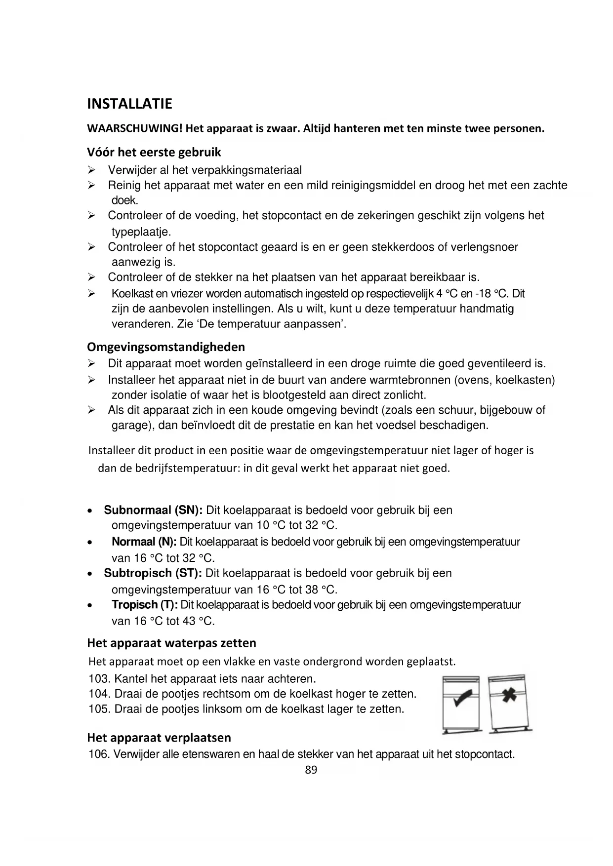- Tropisch (T): Dit koelapparaat is bedoeld voor gebruik bij een omgevingstemperatuur van 16 °C tot 43 °C. Het apparaat waterpas zetten Het apparaat moet op een vlakke en vaste ondergrond worden geplaatst.