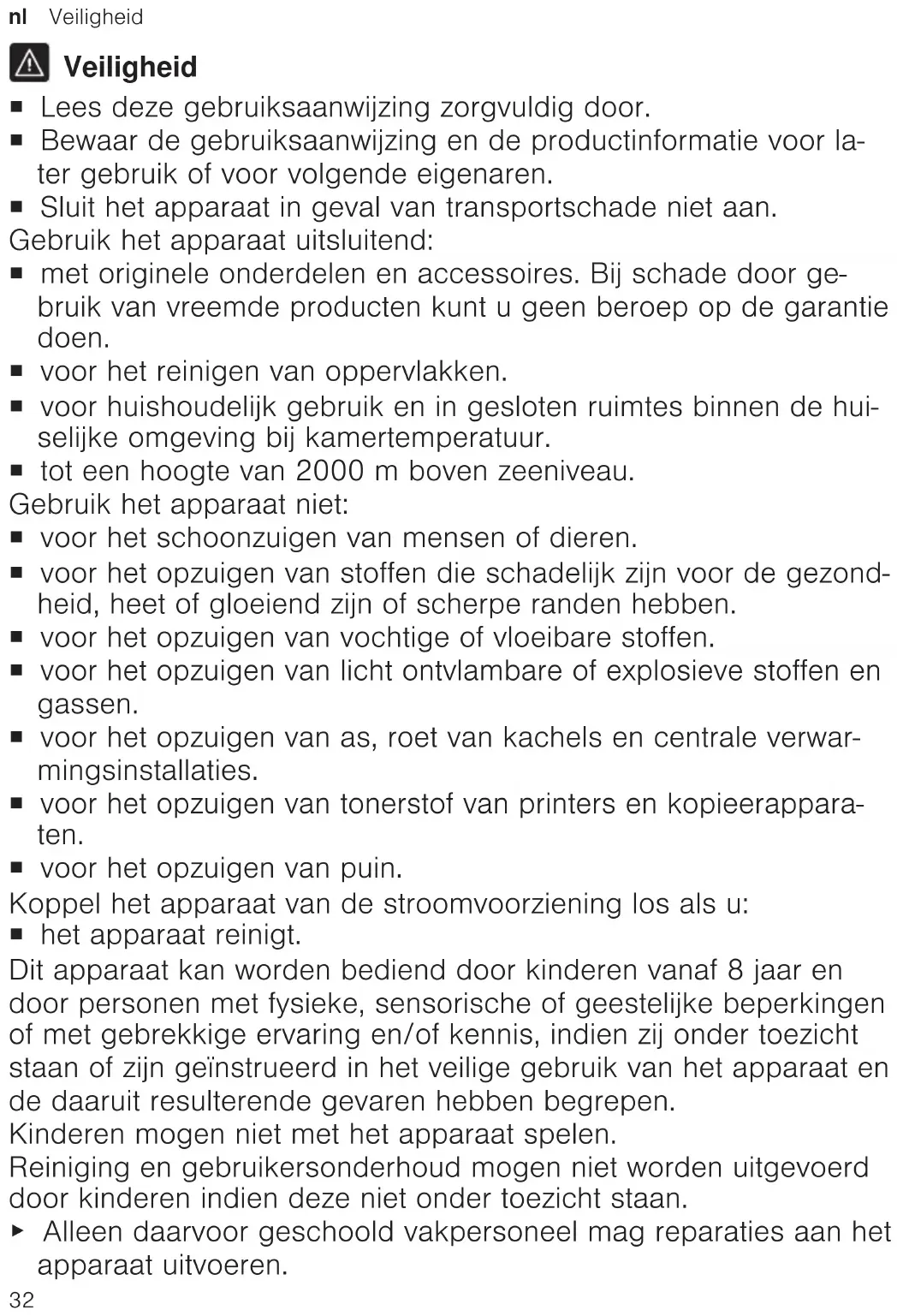 Veiligheid ¡ Lees deze gebruiksaanwijzing zorgvuldig door. ¡ Bewaar de gebruiksaanwijzing en de productinformatie voor la- ter gebruik of voor volgende eigenaren. ¡ Sluit het apparaat in geval van transportschade niet aan. Gebruik het apparaat uitsluitend: ¡ met originele onderdelen en accessoires. Bij schade door ge- bruik van vreemde producten kunt u geen beroep op de garantie doen. ¡ voor het reinigen van oppervlakken. ¡ voor huishoudelijk gebruik en in gesloten ruimtes binnen de hui- selijke omgeving bij kamertemperatuur. ¡ tot een hoogte van 2000m boven zeeniveau. Gebruik het apparaat niet: ¡ voor het schoonzuigen van mensen of dieren. ¡ voor het opzuigen van stoffen die schadelijk zijn voor de gezond- heid, heet of gloeiend zijn of scherpe randen hebben. ¡ voor het opzuigen van vochtige of vloeibare stoffen. ¡ voor het opzuigen van licht ontvlambare of explosieve stoffen en gassen. ¡ voor het opzuigen van as, roet van kachels en centrale verwar- mingsinstallaties. ¡ voor het opzuigen van tonerstof van printers en kopieerappara- ten. ¡ voor het opzuigen van puin. Koppel het apparaat van de stroomvoorziening los als u: ¡ het apparaat reinigt. Dit apparaat kan worden bediend door kinderen vanaf 8 jaar en door personen met fysieke, sensorische of geestelijke beperkingen of met gebrekkige ervaring en/of kennis, indien zij onder toezicht staan of zijn geïnstrueerd in het veilige gebruik van het apparaat en de daaruit resulterende gevaren hebben begrepen. Kinderen mogen niet met het apparaat spelen. Reiniging en gebruikersonderhoud mogen niet worden uitgevoerd door kinderen indien deze niet onder toezicht staan. ▶ Alleen daarvoor geschoold vakpersoneel mag reparaties aan het apparaat uitvoeren.Veiligheid nl