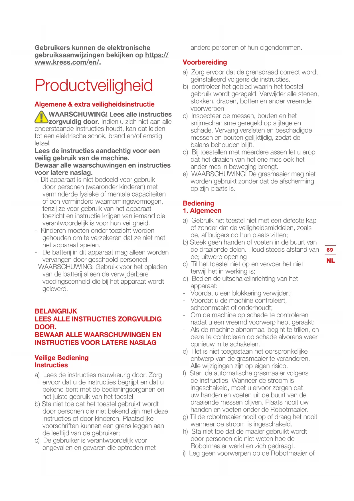 Gebruikers kunnen de elektronische gebruiksaanwijzingen bekijken op https:// www.kress.com/en/. Productveiligheid Algemene & extra veiligheidsinstructie WAARSCHUWING! Lees alle instructies zorgvuldig door. Indien u zich niet aan alle onderstaande instructies houdt, kan dat leiden tot een elektrische schok, brand en/of ernstig letsel. Lees de instructies aandachtig voor een veilig gebruik van de machine. Bewaar alle waarschuwingen en instructies voor latere naslag. - Dit apparaat is niet bedoeld voor gebruik door personen (waaronder kinderen) met verminderde fysieke of mentale capaciteiten of een verminderd waarnemingsvermogen, tenzij ze voor gebruik van het apparaat toezicht en instructie krijgen van iemand die verantwoordelijk is voor hun veiligheid. - Kinderen moeten onder toezicht worden gehouden om te verzekeren dat ze niet met het apparaat spelen. - De batterij in dit apparaat mag alleen worden vervangen door geschoold personeel. WAARSCHUWING: Gebruik voor het opladen van de batterij alleen de verwijderbare voedingseenheid die bij het apparaat wordt geleverd. BELANGRIJK