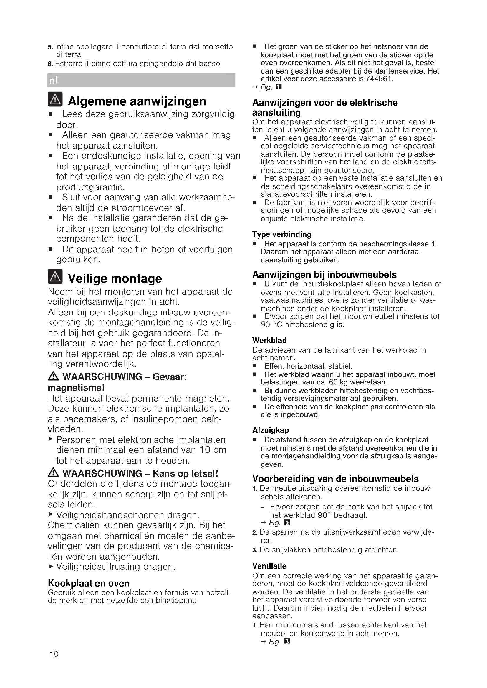 Algemene aanwijzingen ¡ Lees deze gebruiksaanwijzing zorgvuldig door. ¡ Alleen een geautoriseerde vakman mag het apparaat aansluiten. ¡ Een ondeskundige installatie, opening van het apparaat, verbinding of montage leidt tot het verlies van de geldigheid van de productgarantie. ¡ Sluit voor aanvang van alle werkzaamhe- den altijd de stroomtoevoer af. ¡ Na de installatie garanderen dat de ge- bruiker geen toegang tot de elektrische componenten heeft. ¡ Dit apparaat nooit in boten of voertuigen gebruiken. Veilige montage Neem bij het monteren van het apparaat de veiligheidsaanwijzingen in acht. Alleen bij een deskundige inbouw overeen- komstig de montagehandleiding is de veilig- heid bij het gebruik gegarandeerd. De in- stallateur is voor het perfect functioneren van het apparaat op de plaats van opstel- ling verantwoordelijk. WAARSCHUWING‒Gevaar: magnetisme! Het apparaat bevat permanente magneten. Deze kunnen elektronische implantaten, zo- als pacemakers, of insulinepompen beïn- vloeden.