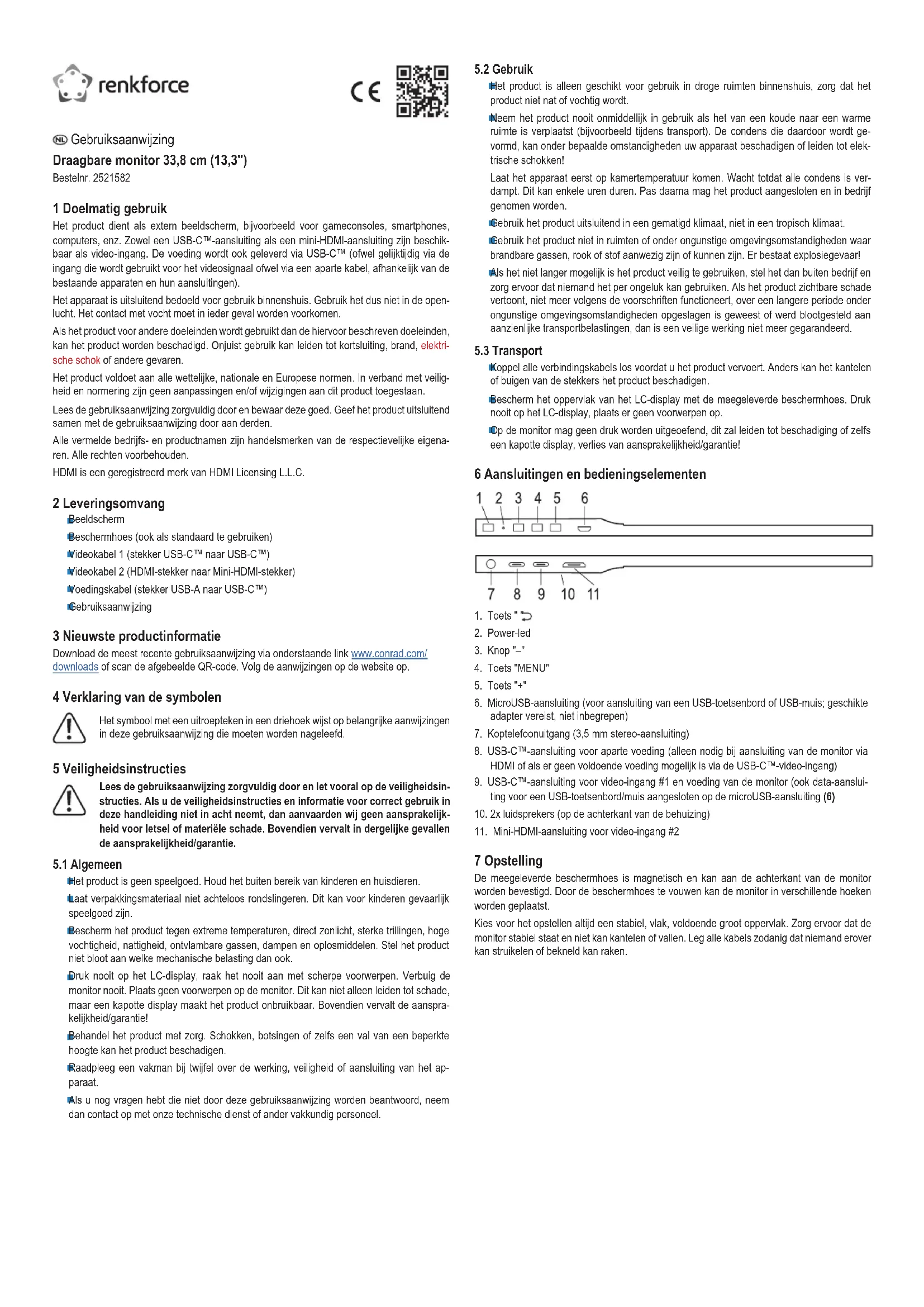 7 Opstelling De meegeleverde beschermhoes is magnetisch en kan aan de achterkant van de monitor worden bevestigd. Door de beschermhoes te vouwen kan de monitor in verschillende hoeken worden geplaatst. Kies voor het opstellen altijd een stabiel, vlak, voldoende groot oppervlak. Zorg ervoor dat de monitor stabiel staat en niet kan kantelen of vallen. Leg alle kabels zodanig dat niemand erover kan struikelen of bekneld kan raken. Gebruiksaanwijzing Draagbare monitor 33,8 cm (13,3") Bestelnr. 2521582 1 Doelmatig gebruik Het product dient als extern beeldscherm, bijvoorbeeld voor gameconsoles, smartphones, computers, enz. Zowel een USB-C™-aansluiting als een mini-HDMI-aansluiting zijn beschik- baar als video-ingang. De voeding wordt ook geleverd via USB-C™ (ofwel gelijktijdig via de ingang die wordt gebruikt voor het videosignaal ofwel via een aparte kabel, afhankelijk van de bestaande apparaten en hun aansluitingen). Het apparaat is uitsluitend bedoeld voor gebruik binnenshuis. Gebruik het dus niet in de open- lucht. Het contact met vocht moet in ieder geval worden voorkomen. Als het product voor andere doeleinden wordt gebruikt dan de hiervoor beschreven doeleinden, kan het product worden beschadigd. Onjuist gebruik kan leiden tot kortsluiting, brand, elektri- sche schok of andere gevaren. Het product voldoet aan alle wettelijke, nationale en Europese normen. In verband met veilig- heid en normering zijn geen aanpassingen en/of wijzigingen aan dit product toegestaan. Lees de gebruiksaanwijzing zorgvuldig door en bewaar deze goed. Geef het product uitsluitend samen met de gebruiksaanwijzing door aan derden. Alle vermelde bedrijfs- en productnamen zijn handelsmerken van de respectievelijke eigena- ren. Alle rechten voorbehouden. HDMI is een geregistreerd merk van HDMI Licensing L.L.C. 2 Leveringsomvang