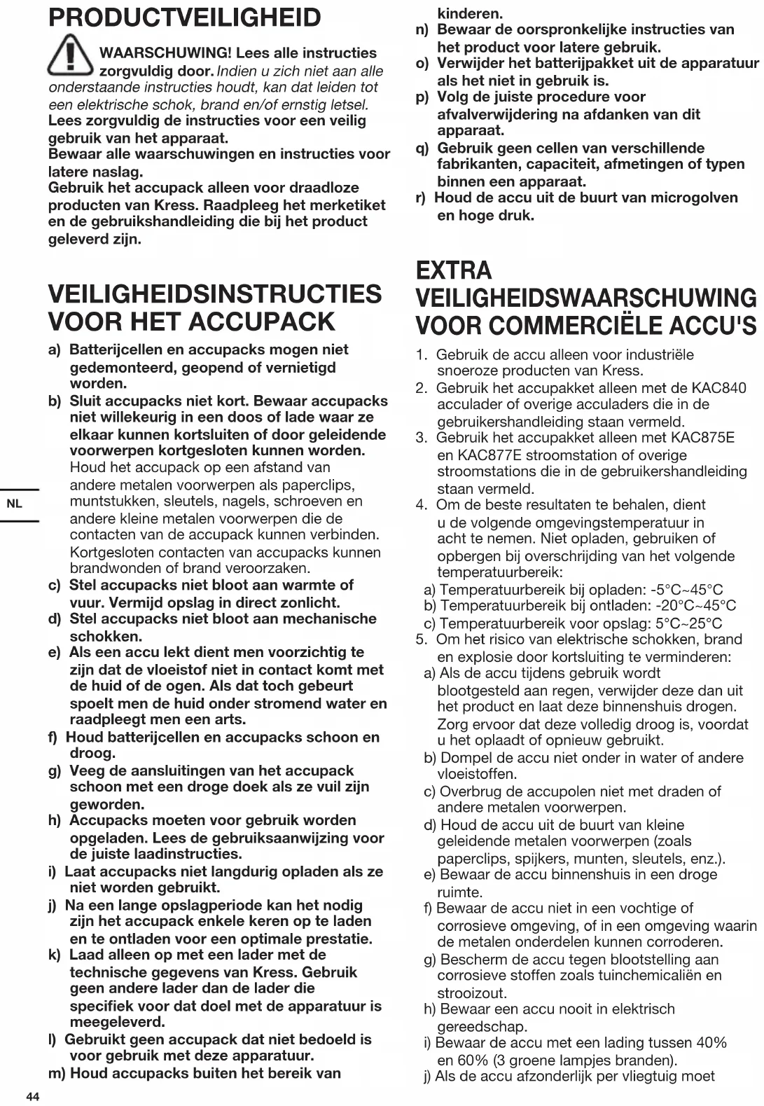 PRODUCTVEILIGHEID WAARSCHUWING! Lees alle instructies zorgvuldig door. Indien u zich niet aan alle onderstaande instructies houdt, kan dat leiden tot een elektrische schok, brand en/of ernstig letsel. Lees zorgvuldig de instructies voor een veilig gebruik van het apparaat. Bewaar alle waarschuwingen en instructies voor latere naslag. Gebruik het accupack alleen voor draadloze producten van Kress. Raadpleeg het merketiket en de gebruikshandleiding die bij het product geleverd zijn. VEILIGHEIDSINSTRUCTIES