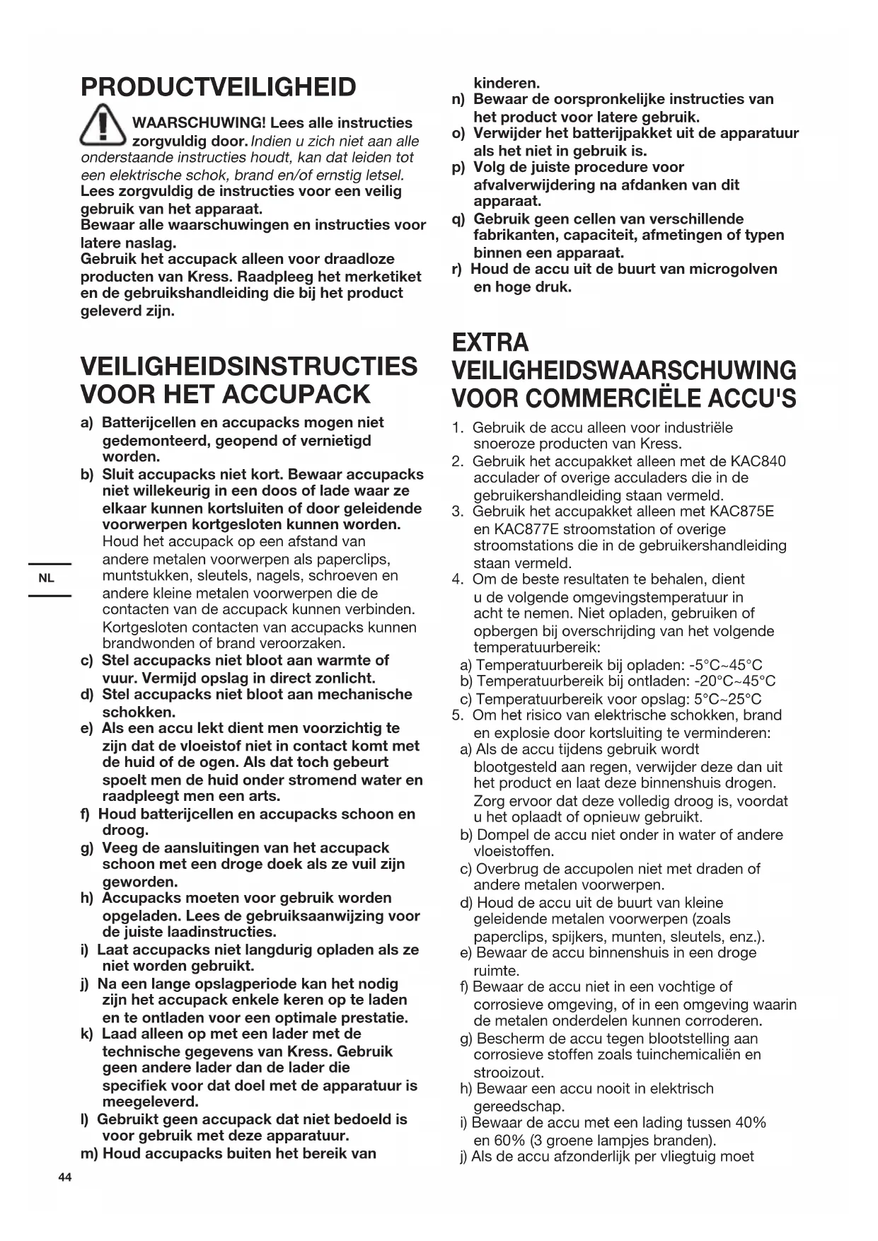 PRODUCTVEILIGHEID WAARSCHUWING! Lees alle instructies zorgvuldig door. Indien u zich niet aan alle onderstaande instructies houdt, kan dat leiden tot een elektrische schok, brand en/of ernstig letsel. Lees zorgvuldig de instructies voor een veilig gebruik van het apparaat. Bewaar alle waarschuwingen en instructies voor latere naslag. Gebruik het accupack alleen voor draadloze producten van Kress. Raadpleeg het merketiket en de gebruikshandleiding die bij het product geleverd zijn. VEILIGHEIDSINSTRUCTIES