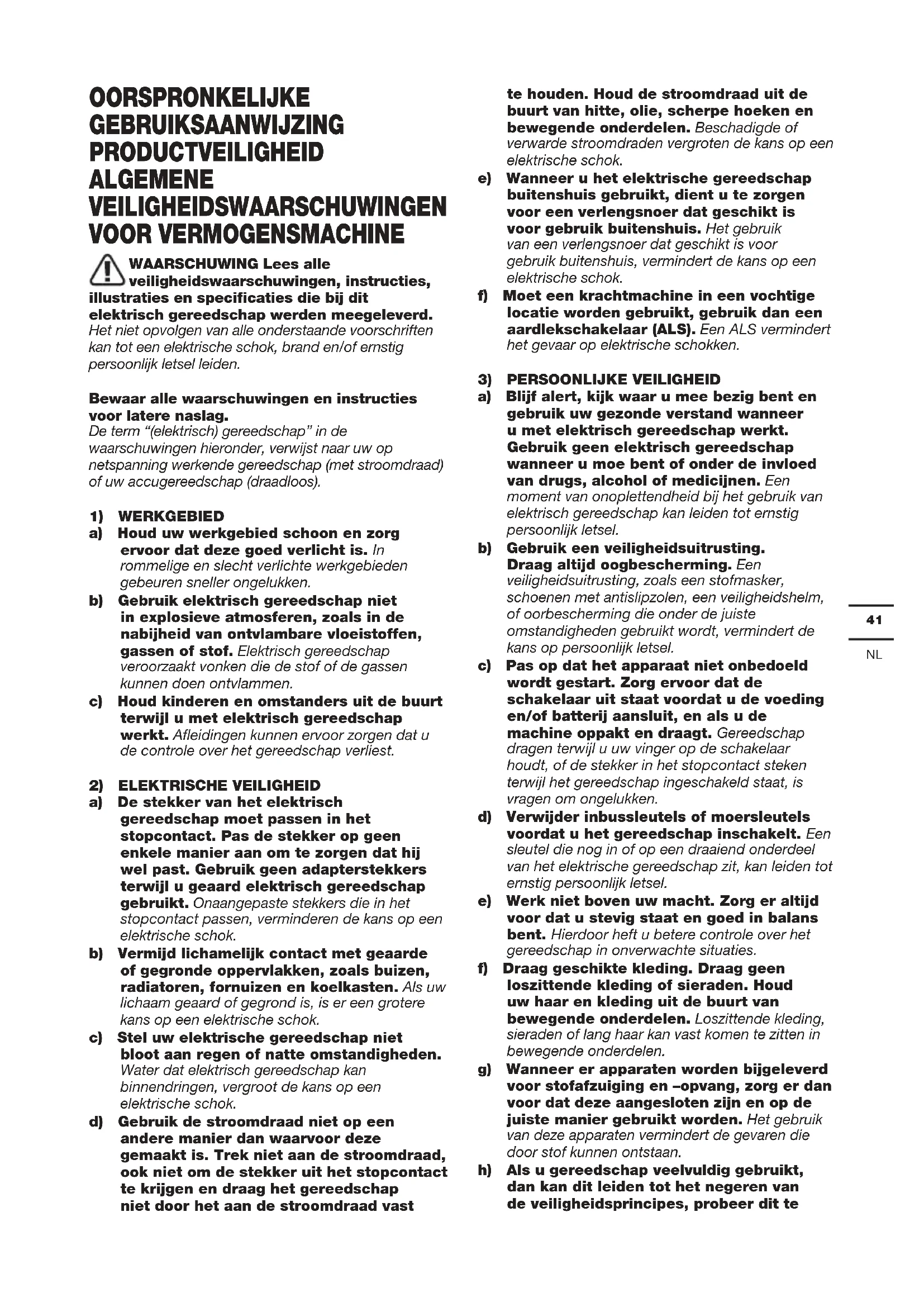 OORSPRONKELIJKE GEBRUIKSAANWIJZING PRODUCTVEILIGHEID ALGEMENE VEILIGHEIDSWAARSCHUWINGEN VOOR VERMOGENSMACHINE WAARSCHUWING Lees alle veiligheidswaarschuwingen, instructies, illustraties en specificaties die bij dit elektrisch gereedschap werden meegeleverd. Het niet opvolgen van alle onderstaande voorschriften kan tot een elektrische schok, brand en/of ernstig persoonlijk letsel leiden. Bewaar alle waarschuwingen en instructies voor latere naslag. De term “(elektrisch) gereedschap” in de waarschuwingen hieronder, verwijst naar uw op netspanning werkende gereedschap (met stroomdraad) of uw accugereedschap (draadloos).