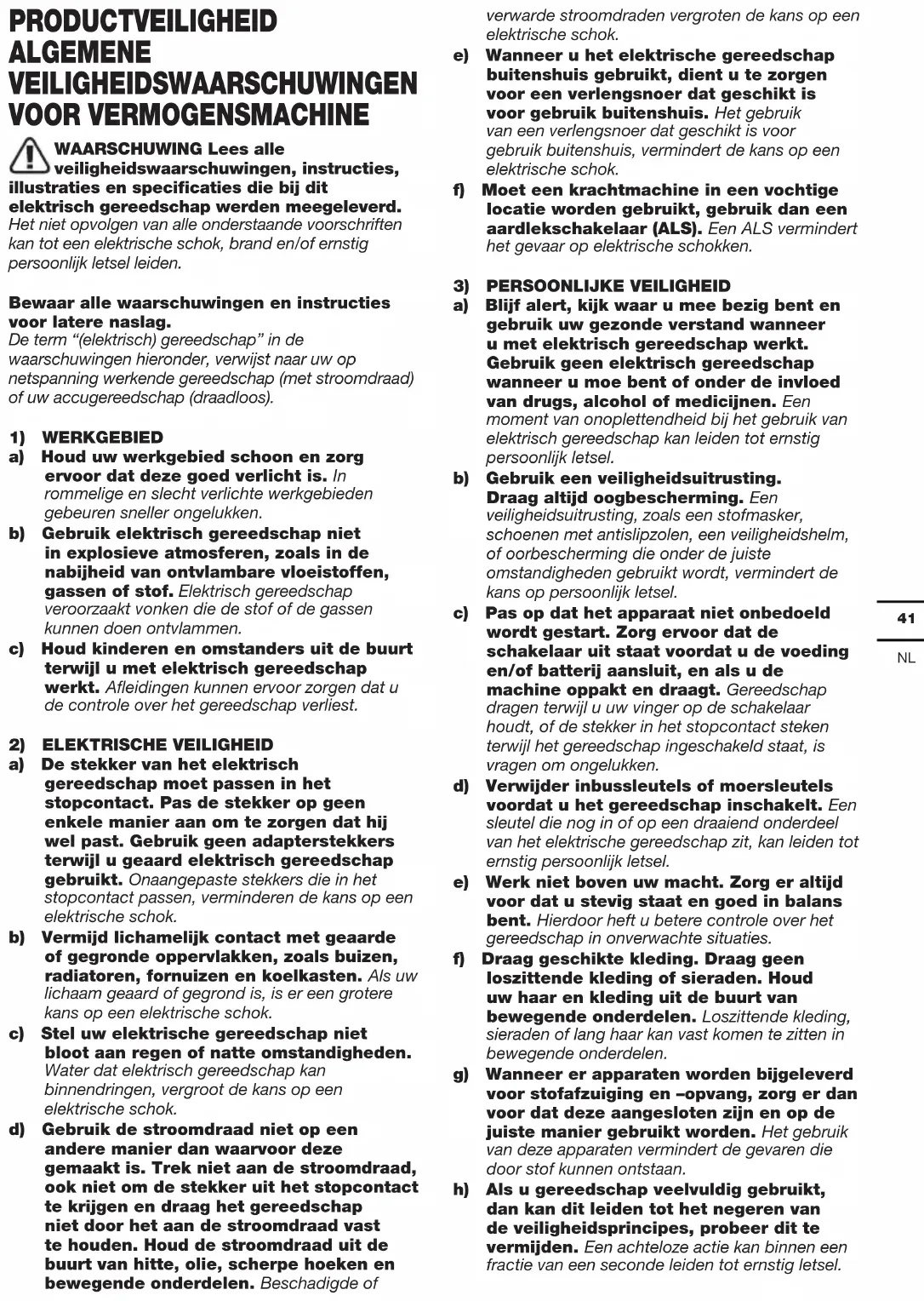 PRODUCTVEILIGHEID ALGEMENE VEILIGHEIDSWAARSCHUWINGEN VOOR VERMOGENSMACHINE WAARSCHUWING Lees alle veiligheidswaarschuwingen, instructies, illustraties en specificaties die bij dit elektrisch gereedschap werden meegeleverd. Het niet opvolgen van alle onderstaande voorschriften kan tot een elektrische schok, brand en/of ernstig persoonlijk letsel leiden. Bewaar alle waarschuwingen en instructies voor latere naslag. De term “(elektrisch) gereedschap” in de waarschuwingen hieronder, verwijst naar uw op netspanning werkende gereedschap (met stroomdraad) of uw accugereedschap (draadloos).