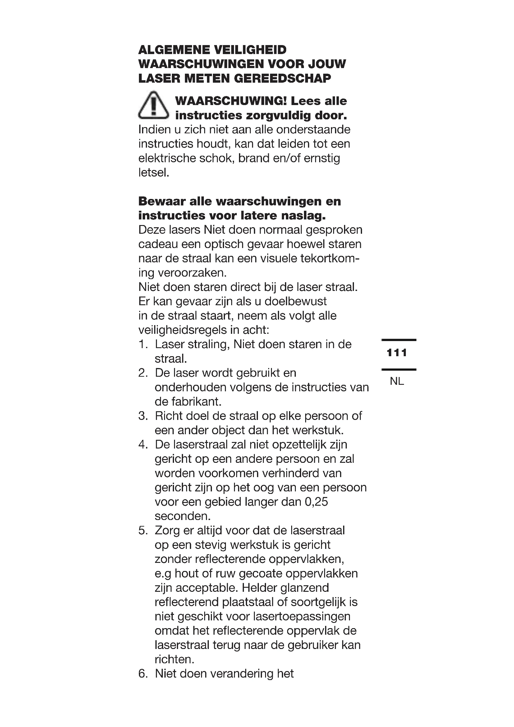 WAARSCHUWING! Lees alle instructies zorgvuldig door. Indien u zich niet aan alle onderstaande instructies houdt, kan dat leiden tot een elektrische schok, brand en/of ernstig letsel. Bewaar alle waarschuwingen en instructies voor latere naslag. Deze lasers Niet doen normaal gesproken cadeau een optisch gevaar hoewel staren naar de straal kan een visuele tekortkom- ing veroorzaken. Niet doen staren direct bij de laser straal. Er kan gevaar zijn als u doelbewust in de straal staart, neem als volgt alle veiligheidsregels in acht: