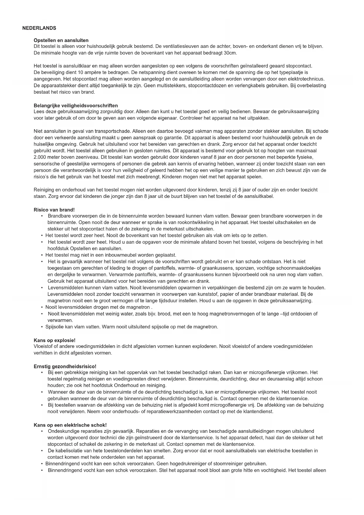 - Spijsolie kan vlam vatten. Warm nooit uitsluitend spijsolie op met de magnetron. Kans op explosie! Vloeistof of andere voedingsmiddelen in dicht afgesloten vormen kunnen exploderen. Nooit vloeistof of andere voedingsmiddelen verhitten in dicht afgesloten vormen. Ernstig gezondheidsrisico!