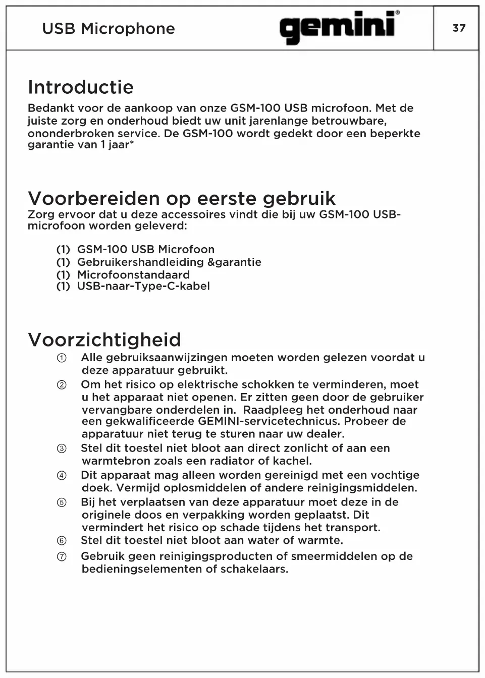 Bedankt voor de aankoop van onze GSM-100 USB microfoon. Met de juiste zorg en onderhoud biedt uw unit jarenlange betrouwbare, ononderbroken service. De GSM-100 wordt gedekt door een beperkte garantie van 1 jaar* Voorbereiden op eerste gebruik Zorg ervoor dat u deze accessoires vindt die bij uw GSM-100 USB- microfoon worden geleverd: (1) GSM-100 USB Microfoon (1) Gebruikershandleiding &garantie (1) Microfoonstandaard (1) USB-naar-Type-C-kabel Voorzichtigheid ① Alle gebruiksaanwijzingen moeten worden gelezen voordat u deze apparatuur gebruikt. ② Om het risico op elektrische schokken te verminderen, moet u het apparaat niet openen. Er zitten geen door de gebruiker vervangbare onderdelen in. Raadpleeg het onderhoud naar een gekwalificeerde GEMINI-servicetechnicus. Probeer de apparatuur niet terug te sturen naar uw dealer. ③ Stel dit toestel niet bloot aan direct zonlicht of aan een warmtebron zoals een radiator of kachel. ④ Dit apparaat mag alleen worden gereinigd met een vochtige doek. Vermijd oplosmiddelen of andere reinigingsmiddelen. ⑤ Bij het verplaatsen van deze apparatuur moet deze in de originele doos en verpakking worden geplaatst. Dit vermindert het risico op schade tijdens het transport. ⑥ Stel dit toestel niet bloot aan water of warmte. ⑦ Gebruik geen reinigingsproducten of smeermiddelen op de bedieningselementen of schakelaars. IntroductieUSB Microphone