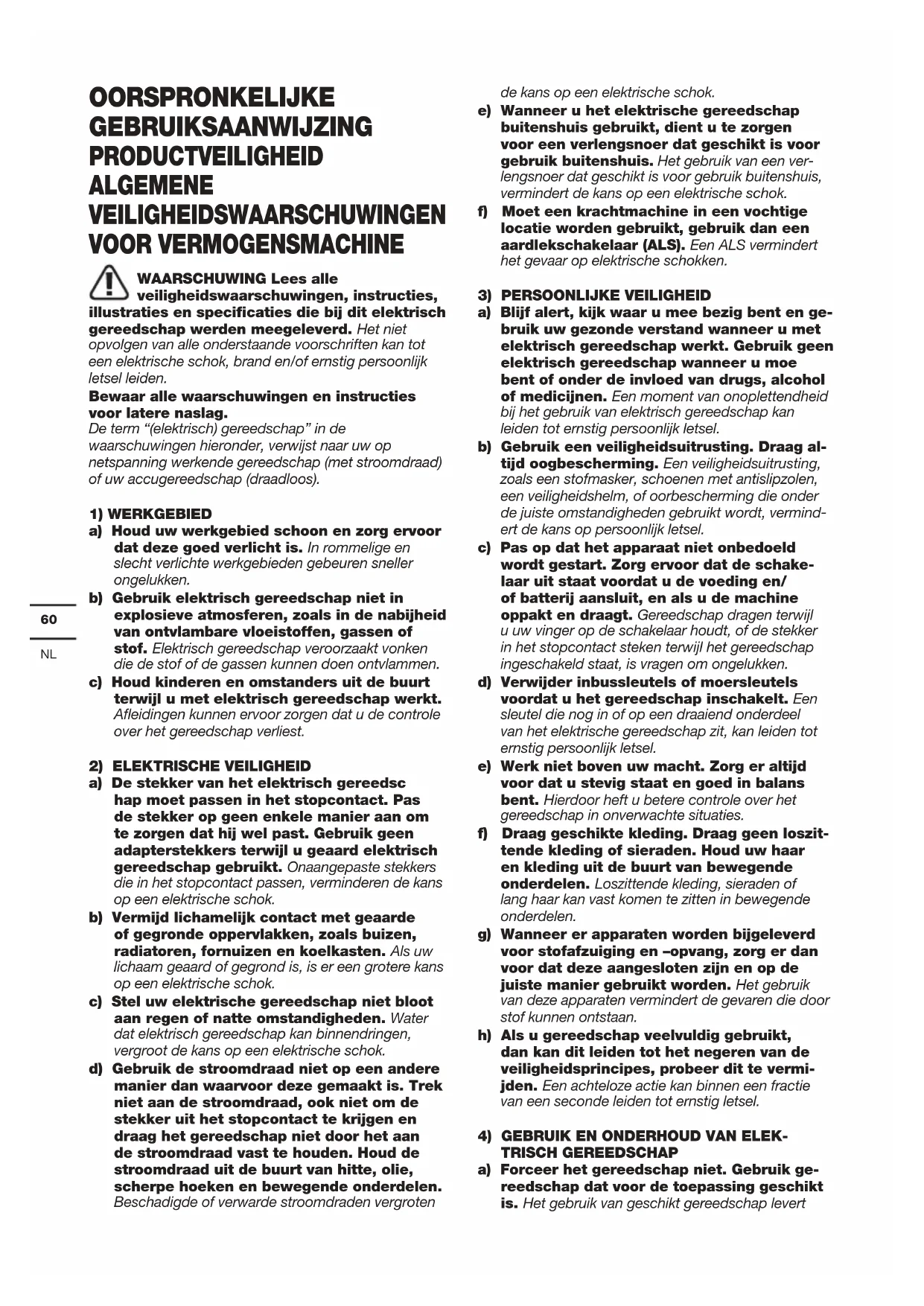 OORSPRONKELIJKE GEBRUIKSAANWIJZING PRODUCTVEILIGHEID ALGEMENE VEILIGHEIDSWAARSCHUWINGEN VOOR VERMOGENSMACHINE WAARSCHUWING Lees alle veiligheidswaarschuwingen, instructies, illustraties en specificaties die bij dit elektrisch gereedschap werden meegeleverd. Het niet opvolgen van alle onderstaande voorschriften kan tot een elektrische schok, brand en/of ernstig persoonlijk letsel leiden. Bewaar alle waarschuwingen en instructies voor latere naslag. De term “(elektrisch) gereedschap” in de waarschuwingen hieronder, verwijst naar uw op netspanning werkende gereedschap (met stroomdraad) of uw accugereedschap (draadloos).
