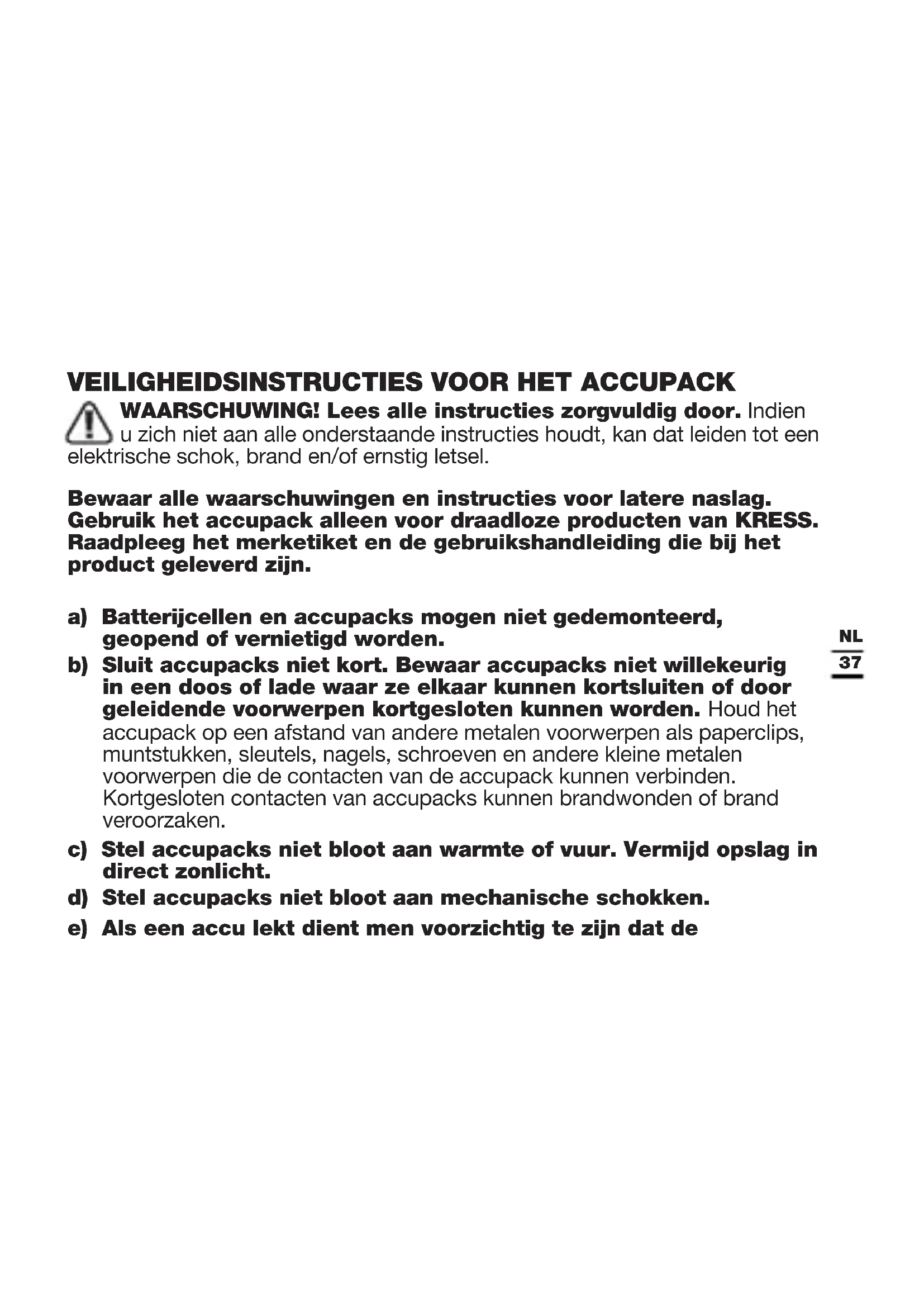 WAARSCHUWING! Lees alle instructies zorgvuldig door. Indien u zich niet aan alle onderstaande instructies houdt, kan dat leiden tot een elektrische schok, brand en/of ernstig letsel. Bewaar alle waarschuwingen en instructies voor latere naslag. Gebruik het accupack alleen voor draadloze producten van KRESS. Raadpleeg het merketiket en de gebruikshandleiding die bij het product geleverd zijn. a) Batterijcellen en accupacks mogen niet gedemonteerd, geopend of vernietigd worden. b) Sluit accupacks niet kort. Bewaar accupacks niet willekeurig in een doos of lade waar ze elkaar kunnen kortsluiten of door geleidende voorwerpen kortgesloten kunnen worden. Houd het accupack op een afstand van andere metalen voorwerpen als paperclips, muntstukken, sleutels, nagels, schroeven en andere kleine metalen voorwerpen die de contacten van de accupack kunnen verbinden. Kortgesloten contacten van accupacks kunnen brandwonden of brand veroorzaken. c) Stel accupacks niet bloot aan warmte of vuur. Vermijd opslag in direct zonlicht. d) Stel accupacks niet bloot aan mechanische schokken. e) Als een accu lekt dient men voorzichtig te zijn dat de38