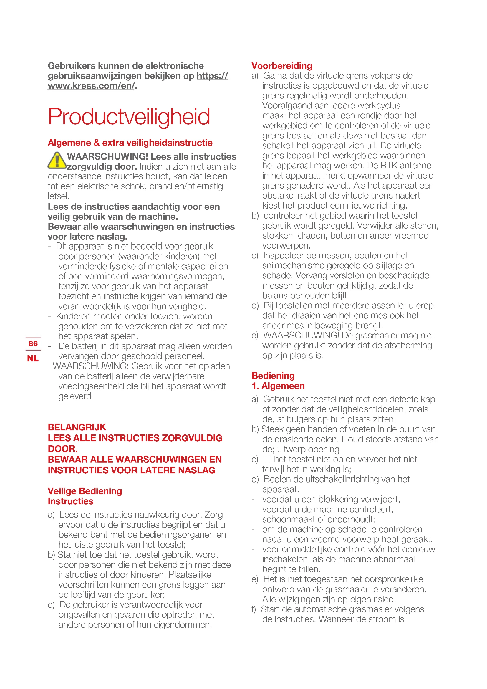 Gebruikers kunnen de elektronische gebruiksaanwijzingen bekijken op https:// www.kress.com/en/. Productveiligheid Algemene & extra veiligheidsinstructie WAARSCHUWING! Lees alle instructies zorgvuldig door. Indien u zich niet aan alle onderstaande instructies houdt, kan dat leiden tot een elektrische schok, brand en/of ernstig letsel. Lees de instructies aandachtig voor een veilig gebruik van de machine. Bewaar alle waarschuwingen en instructies voor latere naslag. - Dit apparaat is niet bedoeld voor gebruik door personen (waaronder kinderen) met verminderde fysieke of mentale capaciteiten of een verminderd waarnemingsvermogen, tenzij ze voor gebruik van het apparaat toezicht en instructie krijgen van iemand die verantwoordelijk is voor hun veiligheid. - Kinderen moeten onder toezicht worden gehouden om te verzekeren dat ze niet met het apparaat spelen. - De batterij in dit apparaat mag alleen worden vervangen door geschoold personeel. WAARSCHUWING: Gebruik voor het opladen van de batterij alleen de verwijderbare voedingseenheid die bij het apparaat wordt geleverd. BELANGRIJK