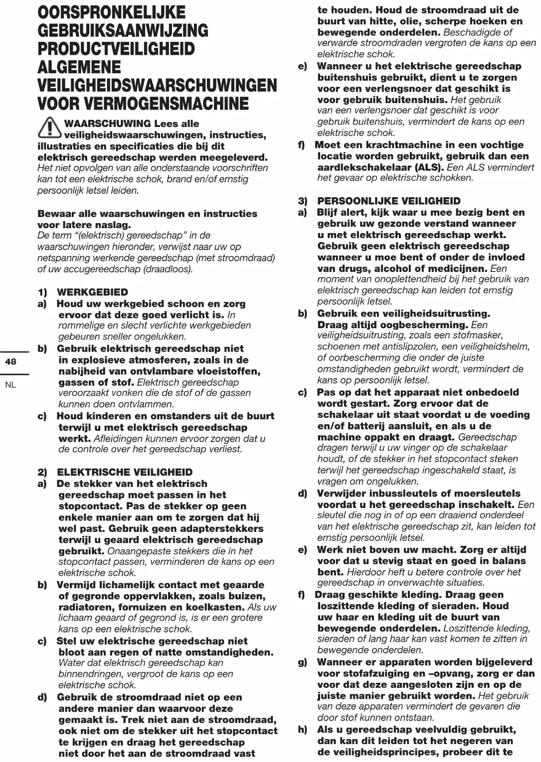 OORSPRONKELIJKE GEBRUIKSAANWIJZING PRODUCTVEILIGHEID ALGEMENE VEILIGHEIDSWAARSCHUWINGEN VOOR VERMOGENSMACHINE WAARSCHUWING Lees alle veiligheidswaarschuwingen, instructies, illustraties en specificaties die bij dit elektrisch gereedschap werden meegeleverd. Het niet opvolgen van alle onderstaande voorschriften kan tot een elektrische schok, brand en/of ernstig persoonlijk letsel leiden. Bewaar alle waarschuwingen en instructies voor latere naslag. De term “(elektrisch) gereedschap” in de waarschuwingen hieronder, verwijst naar uw op netspanning werkende gereedschap (met stroomdraad) of uw accugereedschap (draadloos).