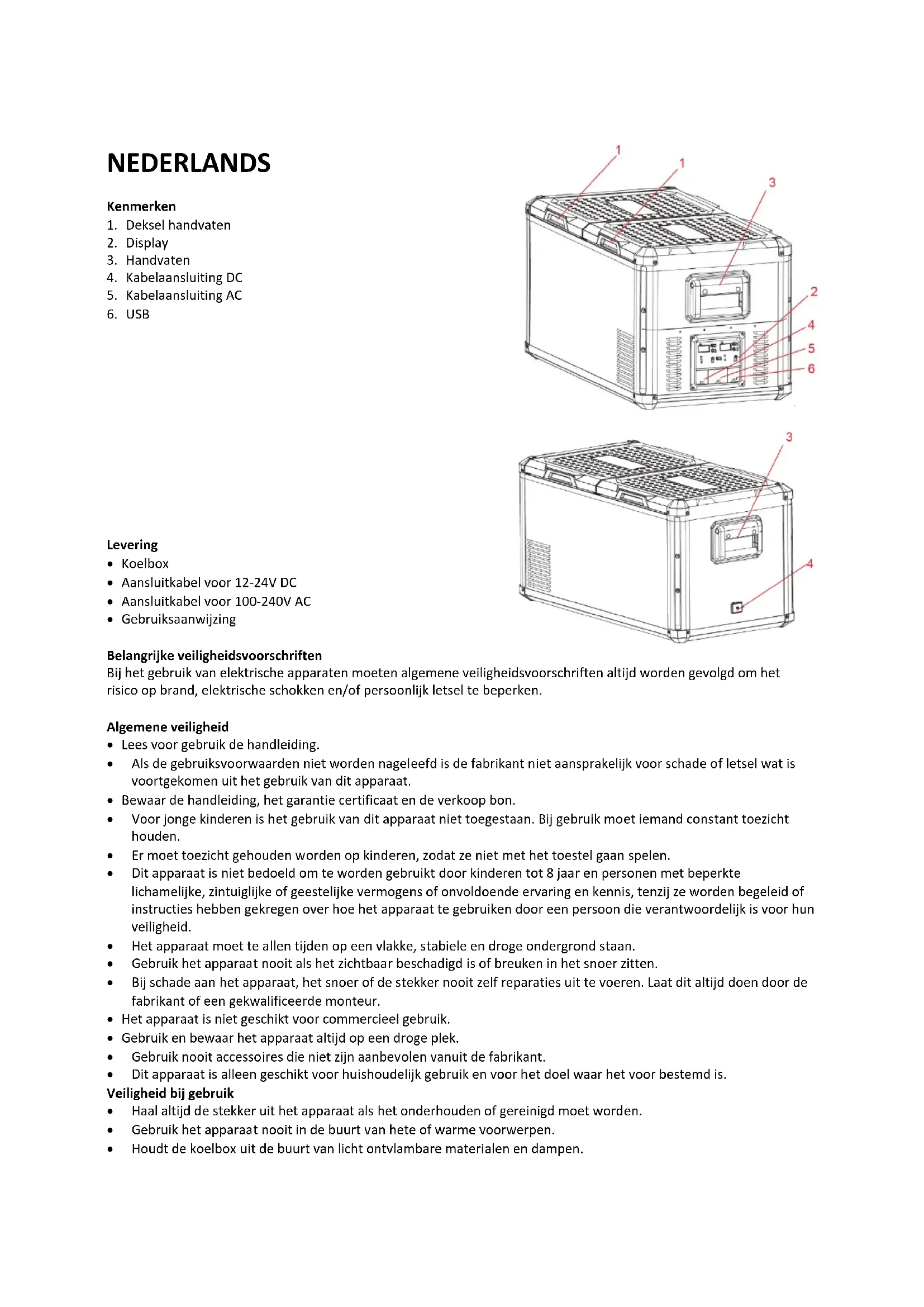 - Houdt de koelbox uit de buurt van licht ontvlambare materialen en dampen.• Voorkom dat het apparaat in aanraking komt met regen.
