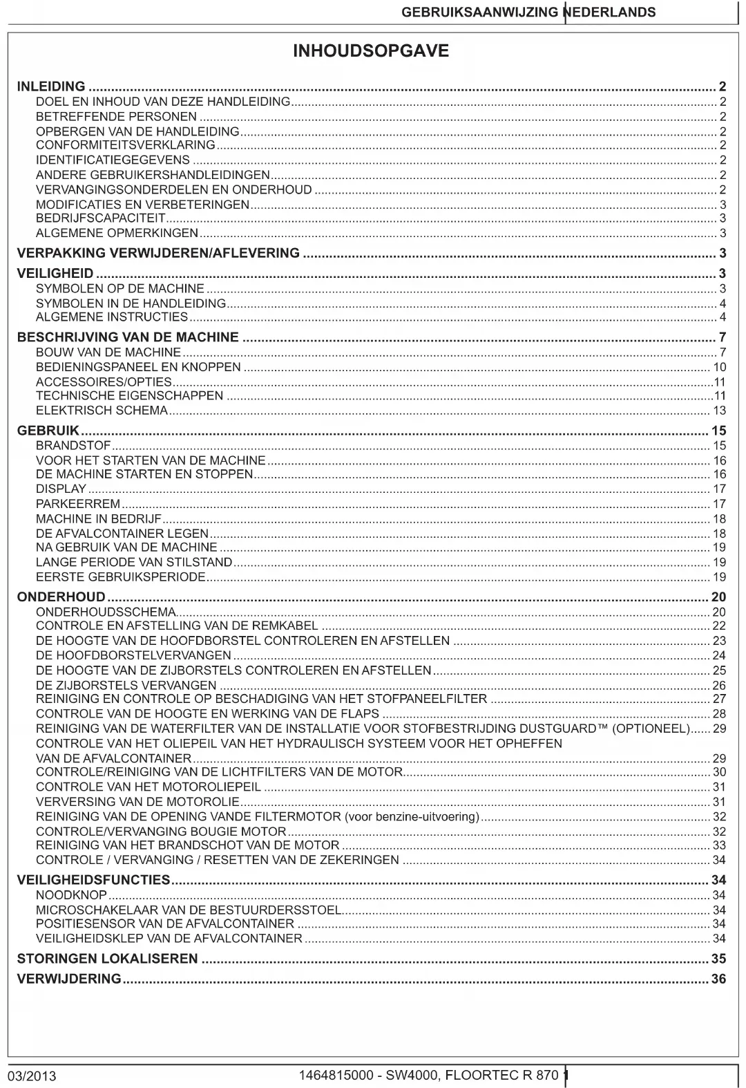 03/2013 LET OP! – De opslagtemperatuur van de machine moet tussen 0 °C en +40 °C liggen. – De temperatuur moet bij gebruik van de machine tussen de 0 °C en +40 °C liggen. – De vochtigheidsgraad moet tussen 30 % en 95 % liggen. – Zorg altijd dat de machine niet in de zon, regen of andere weersomstandigheden staat, zowel in werking als bij stilstand. Berg de machine op in een droge en overdekte ruimte: hij mag niet buiten onder vochtige omstandigheden worden gebruikt of opgeslagen. – Gebruik de machine niet als vervoermiddel of voor slepen/duwen. – De maximale draagkracht van de machine, naast het gewicht van de bediener, is 100 kg (het gewicht van het afval). – Gebruik bij brand een poederbrandblusser. Gebruik geen water. – Pas de bedrijfssnelheid aan de oppervlakken aan. – Vermijd plotseling stoppen als de machine omlaag rijdt. Vermijd scherpe bochten. Laat de machine bij het afdalen met een lagere snelheid rijden. – Deze machine is niet geschikt voor gebruik op straat of openbare wegen. – Verwijder om geen enkele reden de beschermingen van de machine. – Houd u strikt aan de aanwijzingen bij gewone onderhoudswerkzaamheden. – Zorg dat er geen voorwerpen door de openingen komen. Als de openingen zijn verstopt, mag de machine niet worden gebruikt. Houd de openingen van de machine vrij van stof, draden, haren en andere vreemde voorwerpen die de luchtstroom kunnen belemmeren. – (Alleen voor uitvoering met installatie voor stofbestrijding DustGuard™ gemonteerd). Let goed op als de machine bij vriestemperaturen wordt verplaatst. Het water in de tank van het systeem of de slangen kan bevriezen en de machine ernstig beschadigen. – Verwijder of verander geen plaatjes van de fabrikant op de machine. – Als de machine vanwege servicewerkzaamheden moet worden geduwd (geen brandstof, motorstoring, etc.), laat de machine dan nooit harder rijden dan 4 km/u. – Als u afwijkingen in de werking van de machine vermoedt, controleer dan of deze niet worden veroorzaakt door gebrek aan dagelijks onderhoud. Als dat niet het geval is, roept u de hulp in van bevoegd personeel of van een bevoegd servicecentrum. – Vraag bij vervanging van onderdelen om ORIGINELE vervangingsonderdelen bij een bevoegd leverancier en/of bevoegde detailhandelaar. – Uit veiligheidsoverwegingen en voor een correcte werking van de machine moet het onderhoud dat in het betreffende hoofdstuk in deze handleiding wordt aangegeven voor bevoegd personeel of bij een servicecentrum worden uitgevoerd. – Laat de machine als hij wordt afgedankt niet onbemand staan vanwege de giftige en/of schadelijke materialen (accu’s, olie, etc.). Deze moeten volgens de voorschriften naar de daarvoor bestemde verzamelplaatsen worden gebracht (zie het hoofdstuk Verwijdering). – Tijdens de werking van de motor wordt de demper warm; raak de demper nooit aan als hij warm is om brandwonden of brand te voorkomen. – Laat de motor nooit draaien met onvoldoende olie, want dat kan ernstige schade veroorzaken. Controleer het oliepeil bij een uitgeschakelde motor terwijl de machine horizontaal staat. – Laat de motor nooit zonder luchtlter draaien, omdat dit schade kan veroorzaken. – Technische werkzaamheden aan de motor moeten altijd door een bevoegd dealer worden uitgevoerd. Gebruik voor de motor alleen originele vervangingsonderdelen of equivalenten ervan. Het gebruik van vervangingsonderdelen van een mindere kwaliteit kan de motor ernstig beschadigen. – Zie ook de VEILIGHEIDSVOORSCHRIFTEN in de handleiding van de motor, die een integraal deel vormt van deze handleiding.GEBRUIKSAANWIJZING NEDERLANDS