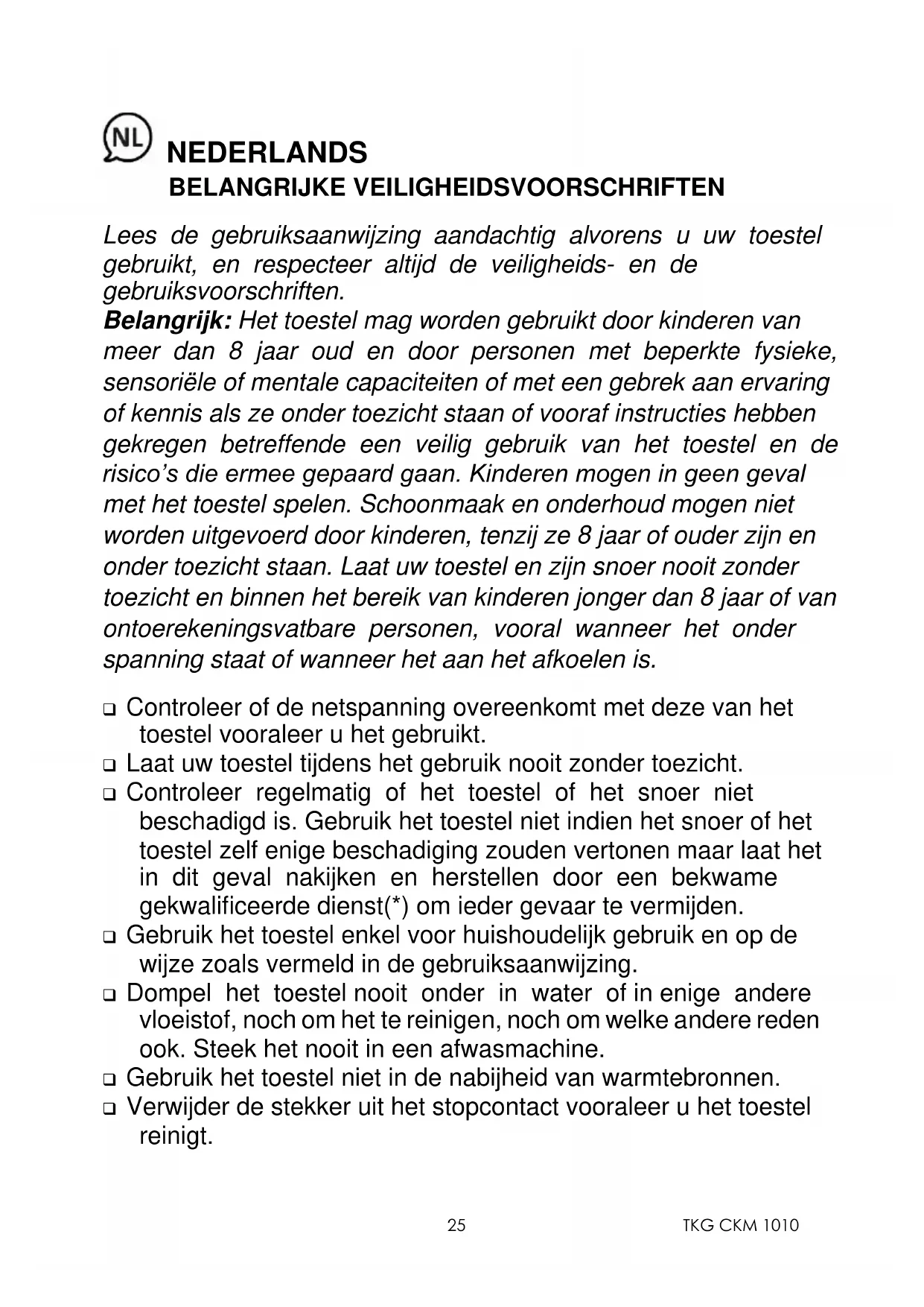 NEDERLANDS BELANGRIJKE VEILIGHEIDSVOORSCHRIFTEN Lees de gebruiksaanwijzing aandachtig alvorens u uw toestel gebruikt, en respecteer altijd de veiligheids- en de gebruiksvoorschriften. Belangrijk: Het toestel mag worden gebruikt door kinderen van meer dan 8 jaar oud en door personen met beperkte fysieke, sensoriële of mentale capaciteiten of met een gebrek aan ervaring of kennis als ze onder toezicht staan of vooraf instructies hebben gekregen betreffende een veilig gebruik van het toestel en de risico’s die ermee gepaard gaan. Kinderen mogen in geen geval met het toestel spelen. Schoonmaak en onderhoud mogen niet worden uitgevoerd door kinderen, tenzij ze 8 jaar of ouder zijn en onder toezicht staan. Laat uw toestel en zijn snoer nooit zonder toezicht en binnen het bereik van kinderen jonger dan 8 jaar of van ontoerekeningsvatbare personen, vooral wanneer het onder spanning staat of wanneer het aan het afkoelen is. ❑ Controleer of de netspanning overeenkomt met deze van het toestel vooraleer u het gebruikt. ❑ Laat uw toestel tijdens het gebruik nooit zonder toezicht. ❑ Controleer regelmatig of het toestel of het snoer niet beschadigd is. Gebruik het toestel niet indien het snoer of het toestel zelf enige beschadiging zouden vertonen maar laat het in dit geval nakijken en herstellen door een bekwame gekwalificeerde dienst(*) om ieder gevaar te vermijden. ❑ Gebruik het toestel enkel voor huishoudelijk gebruik en op de wijze zoals vermeld in de gebruiksaanwijzing. ❑ Dompel het toestel nooit onder in water of in enige andere vloeistof, noch om het te reinigen, noch om welke andere reden ook. Steek het nooit in een afwasmachine. ❑ Gebruik het toestel niet in de nabijheid van warmtebronnen. ❑ Verwijder de stekker uit het stopcontact vooraleer u het toestel reinigt.TKG CKM 1010