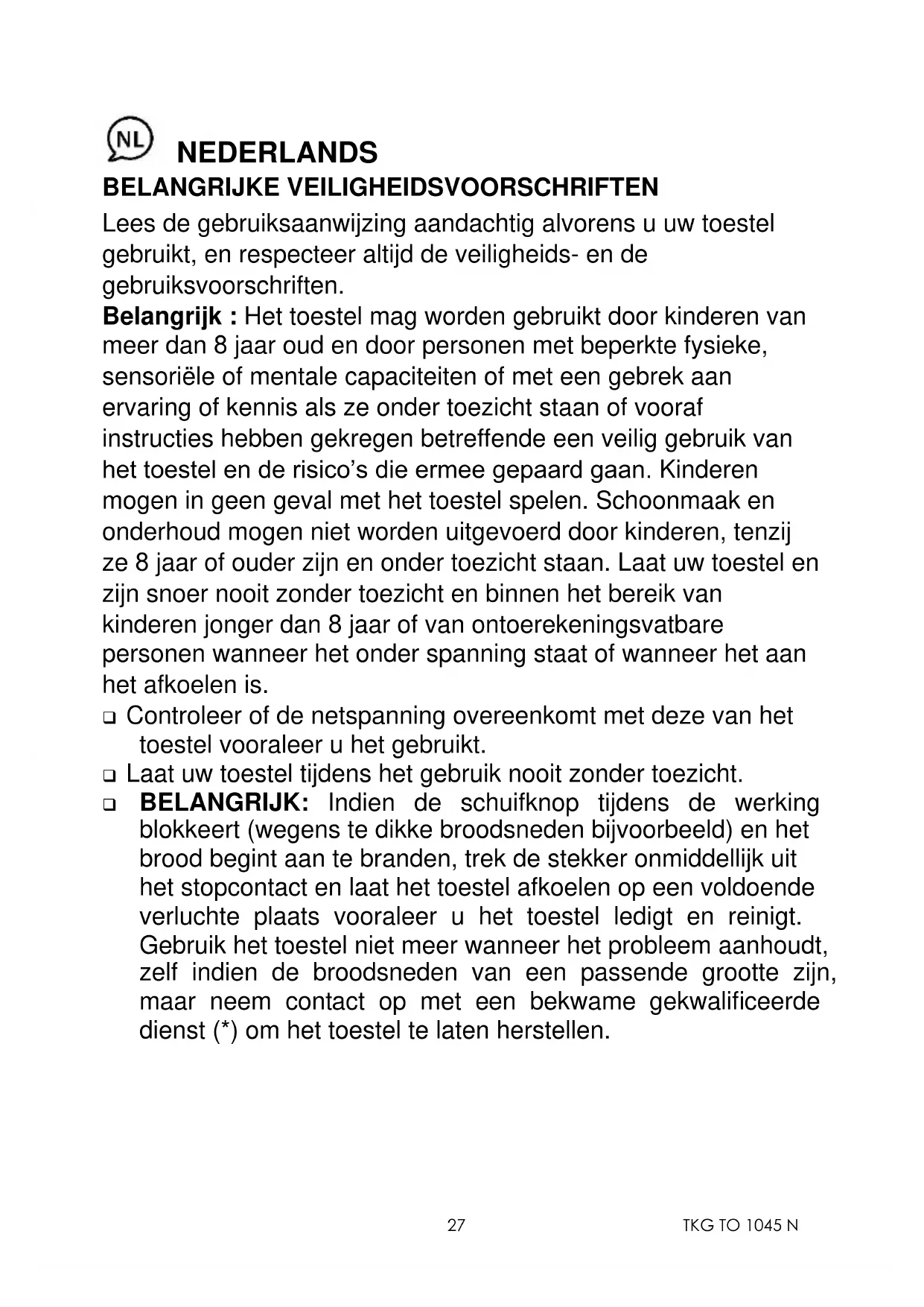 NEDERLANDS BELANGRIJKE VEILIGHEIDSVOORSCHRIFTEN Lees de gebruiksaanwijzing aandachtig alvorens u uw toestel gebruikt, en respecteer altijd de veiligheids- en de gebruiksvoorschriften. Belangrijk : Het toestel mag worden gebruikt door kinderen van meer dan 8 jaar oud en door personen met beperkte fysieke, sensoriële of mentale capaciteiten of met een gebrek aan ervaring of kennis als ze onder toezicht staan of vooraf instructies hebben gekregen betreffende een veilig gebruik van het toestel en de risico’s die ermee gepaard gaan. Kinderen mogen in geen geval met het toestel spelen. Schoonmaak en onderhoud mogen niet worden uitgevoerd door kinderen, tenzij ze 8 jaar of ouder zijn en onder toezicht staan. Laat uw toestel en zijn snoer nooit zonder toezicht en binnen het bereik van kinderen jonger dan 8 jaar of van ontoerekeningsvatbare personen wanneer het onder spanning staat of wanneer het aan het afkoelen is. ❑ Controleer of de netspanning overeenkomt met deze van het toestel vooraleer u het gebruikt. ❑ Laat uw toestel tijdens het gebruik nooit zonder toezicht. ❑ BELANGRIJK: Indien de schuifknop tijdens de werking blokkeert (wegens te dikke broodsneden bijvoorbeeld) en het brood begint aan te branden, trek de stekker onmiddellijk uit het stopcontact en laat het toestel afkoelen op een voldoende verluchte plaats vooraleer u het toestel ledigt en reinigt. Gebruik het toestel niet meer wanneer het probleem aanhoudt, zelf indien de broodsneden van een passende grootte zijn, maar neem contact op met een bekwame gekwalificeerde dienst (*) om het toestel te laten herstellen.TKG TO 1045 N