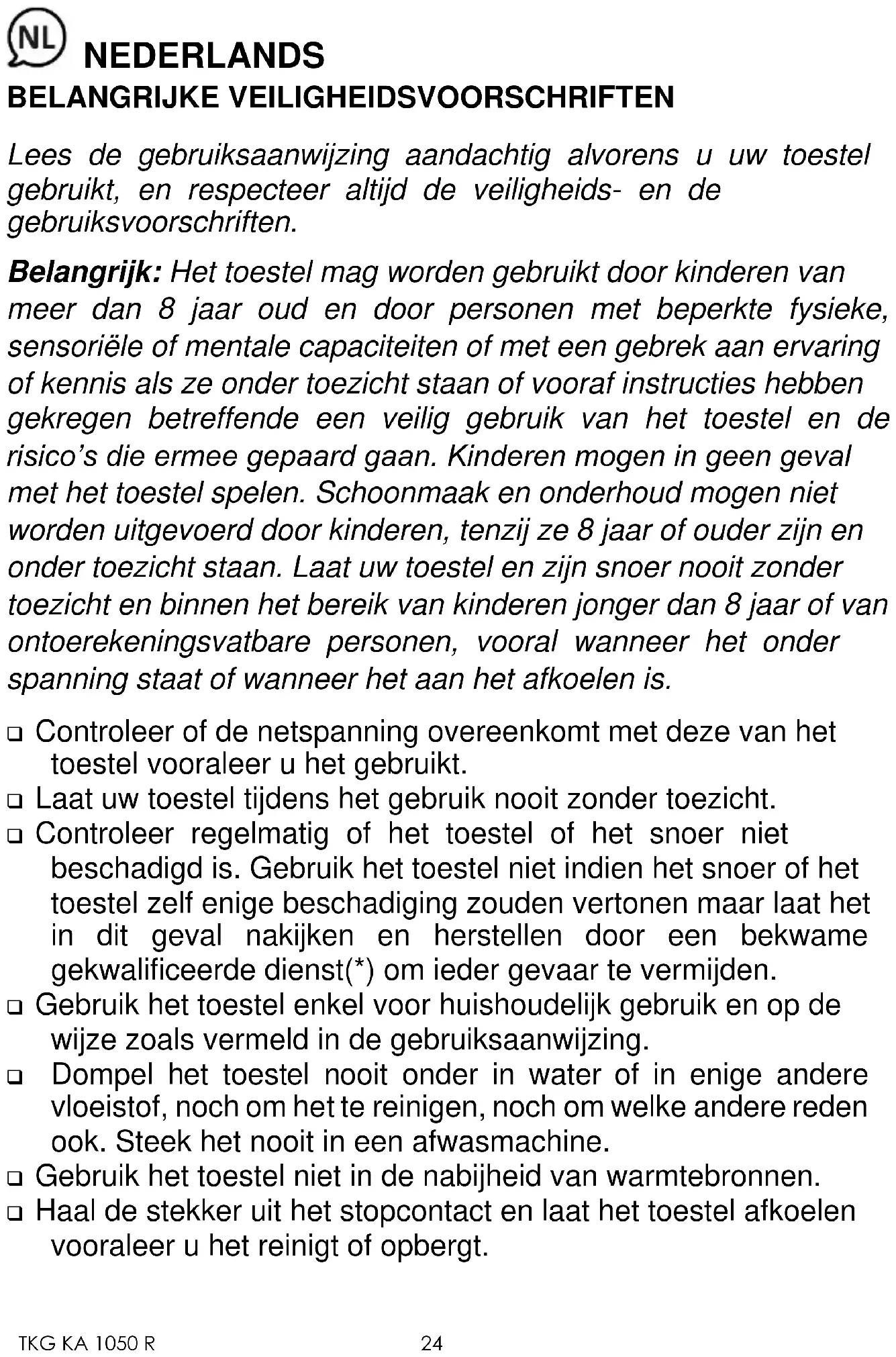 ❑ Gebruik het toestel niet buiten en berg het op in een droge ruimte. ❑ Gebruik geen accessoires die niet door de fabrikant werden aanbevolen. ❑ Trek nooit aan het snoer om het toestel te verplaatsen. ❑ Plaats het toestel op een tafel of op een voldoende stabiel oppervlak zodat het niet valt en zorg ervoor dat het elektriciteitssnoer nergens kan achterhaken. Draai het snoer niet rond het toestel en plooi het niet. ❑ Gebruik uw toestel niet indien de koffiekan gebarsten of gebroken is. Gebruik enkel de koffiekan die met uw toestel meegeleverd is. Opgepast: uw koffiekan wordt heet tijdens het gebruik. Houd het bij het handvat vast. ❑ Let erop dat u de warme onderdelen van het toestel niet aanraakt (opgepast: de plaat waarop de koffiekan wordt neergezet, is eveneens warm!). Hanteer enkel de plastic delen. Gebruik het handvat om de koffiekan op te heffen. ❑ Zorg ervoor dat het toestel nooit in contact komt met ontvlambare stoffen zoals gordijnen en dergelijke wanneer het in gebruik is om brand te vermijden. ❑ Gebruik voor het ontkalken enkel speciaal hiervoor bestemde producten. Gebruik geen ammoniak of andere stof die uw gezondheid zou kunnen schaden. ❑ Schep enkel gemalen koffie in de filter. ❑ Laat uw koffiezetapparaat niet werken zonder water. ❑ Zet de koffiekan nooit in een microgolfoven. ❑ Bij onjuist gebruik kan het apparaat zichzelf beschadigen of een gevaar voor de gebruiker vormen. In dat geval is de garantie niet langer van toepassing en kan de producent niet aansprakelijk worden gesteld voor eventuele schade. (*) Bekwame gekwalificeerde dienst: klantendienst van de fabrikant of de invoerder, die erkend en bevoegd is om dergelijke herstellingen te doen zodat elk gevaar vermeden wordt. Gelieve het toestel bij problemen naar deze dienst terug te brengen.TKG KA 1050 R