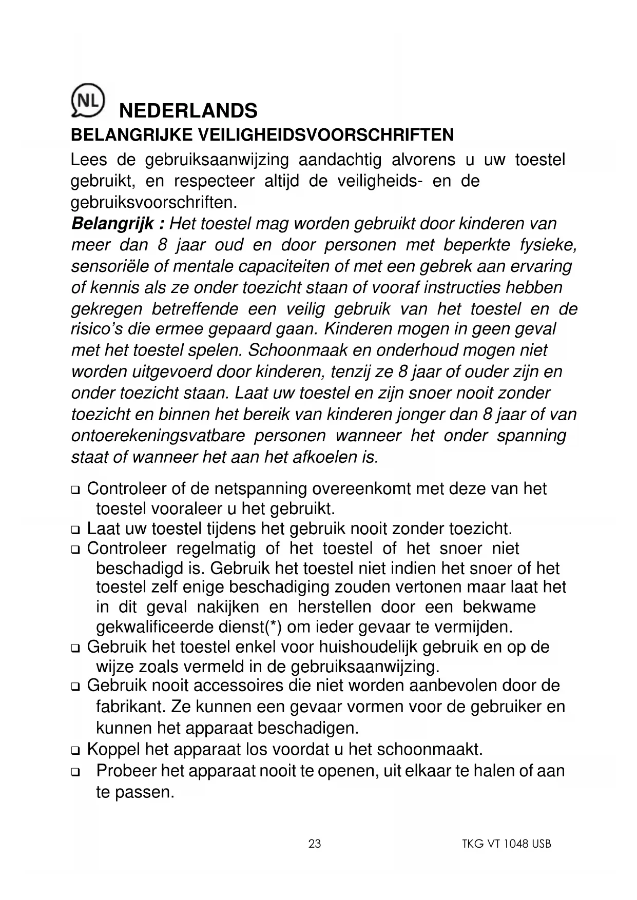NEDERLANDS BELANGRIJKE VEILIGHEIDSVOORSCHRIFTEN Lees de gebruiksaanwijzing aandachtig alvorens u uw toestel gebruikt, en respecteer altijd de veiligheids- en de gebruiksvoorschriften. Belangrijk : Het toestel mag worden gebruikt door kinderen van meer dan 8 jaar oud en door personen met beperkte fysieke, sensoriële of mentale capaciteiten of met een gebrek aan ervaring of kennis als ze onder toezicht staan of vooraf instructies hebben gekregen betreffende een veilig gebruik van het toestel en de risico’s die ermee gepaard gaan. Kinderen mogen in geen geval met het toestel spelen. Schoonmaak en onderhoud mogen niet worden uitgevoerd door kinderen, tenzij ze 8 jaar of ouder zijn en onder toezicht staan. Laat uw toestel en zijn snoer nooit zonder toezicht en binnen het bereik van kinderen jonger dan 8 jaar of van ontoerekeningsvatbare personen wanneer het onder spanning staat of wanneer het aan het afkoelen is. ❑ Controleer of de netspanning overeenkomt met deze van het toestel vooraleer u het gebruikt. ❑ Laat uw toestel tijdens het gebruik nooit zonder toezicht. ❑ Controleer regelmatig of het toestel of het snoer niet beschadigd is. Gebruik het toestel niet indien het snoer of het toestel zelf enige beschadiging zouden vertonen maar laat het in dit geval nakijken en herstellen door een bekwame gekwalificeerde dienst(*) om ieder gevaar te vermijden. ❑ Gebruik het toestel enkel voor huishoudelijk gebruik en op de wijze zoals vermeld in de gebruiksaanwijzing. ❑ Gebruik nooit accessoires die niet worden aanbevolen door de fabrikant. Ze kunnen een gevaar vormen voor de gebruiker en kunnen het apparaat beschadigen. ❑ Koppel het apparaat los voordat u het schoonmaakt. ❑ Probeer het apparaat nooit te openen, uit elkaar te halen of aan te passen.TKG VT 1048 USB