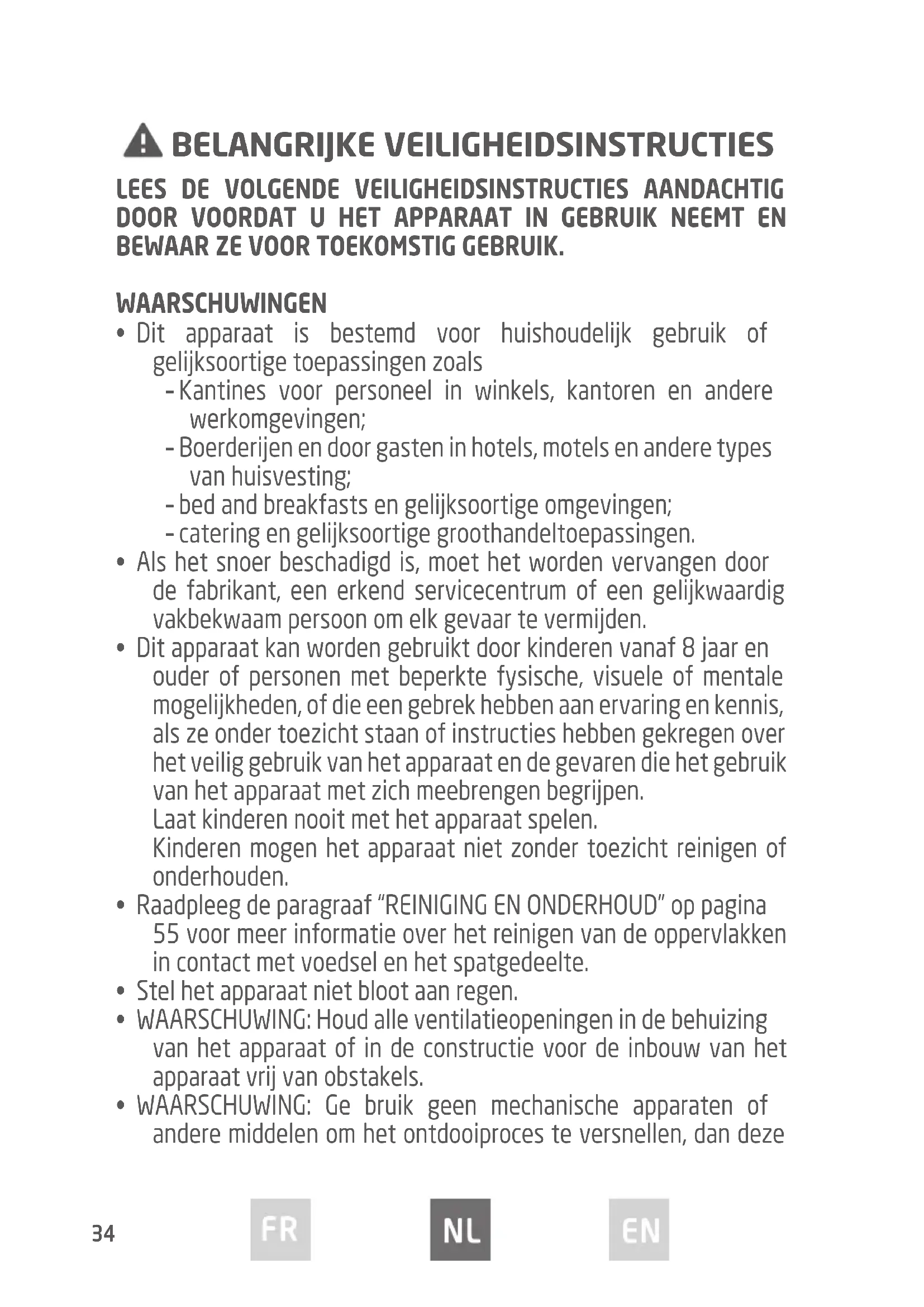 - WAARSCHUWING: Ge bruik geen mechanische apparaten of andere middelen om het ontdooiproces te versnellen, dan deze BELANGRIJKE VEILIGHEIDSINSTRUCTIES35 aanbevolen door de fabrikant.