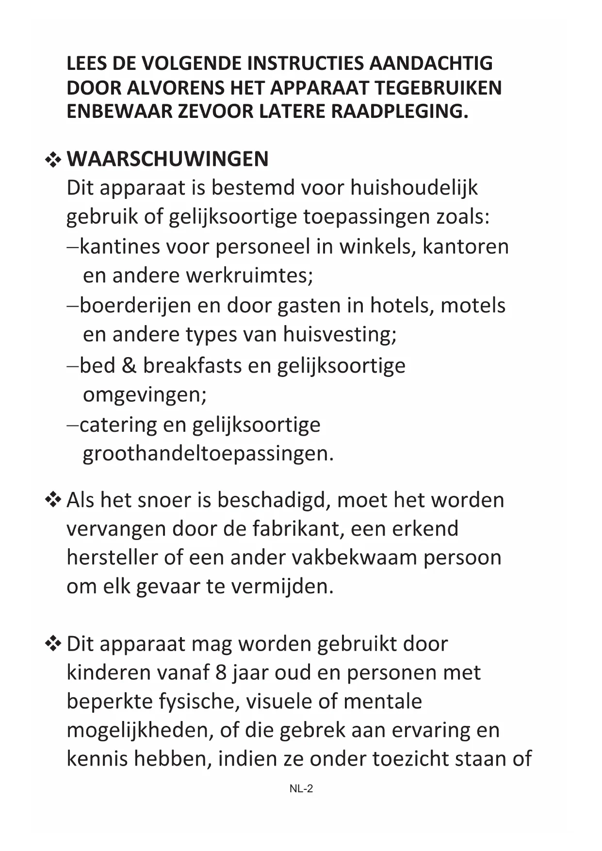 VERWIJDERING ................................................................6 Dit apparaat is bestemd voor huishoudelijk gebruik of gelijksoortige toepassingen zoals: kantines voor personeel in winkels, kantoren en andere werkruimtes; boerderijen en door gasten in hotels, motels en andere types van huisvesting; bed & breakfasts en gelijksoortige omgevingen; catering en gelijksoortige groothandeltoepassingen. Als het snoer is beschadigd, moet het worden vervangen door de fabrikant, een erkend hersteller of een ander vakbekwaam persoon om elk gevaar te vermijden. Dit apparaat mag worden gebruikt door kinderen vanaf 8 jaar oud en personen met beperkte fysische, visuele of mentale mogelijkheden, of die gebrek aan ervaring en kennis hebben, indien ze onder toezicht staan of