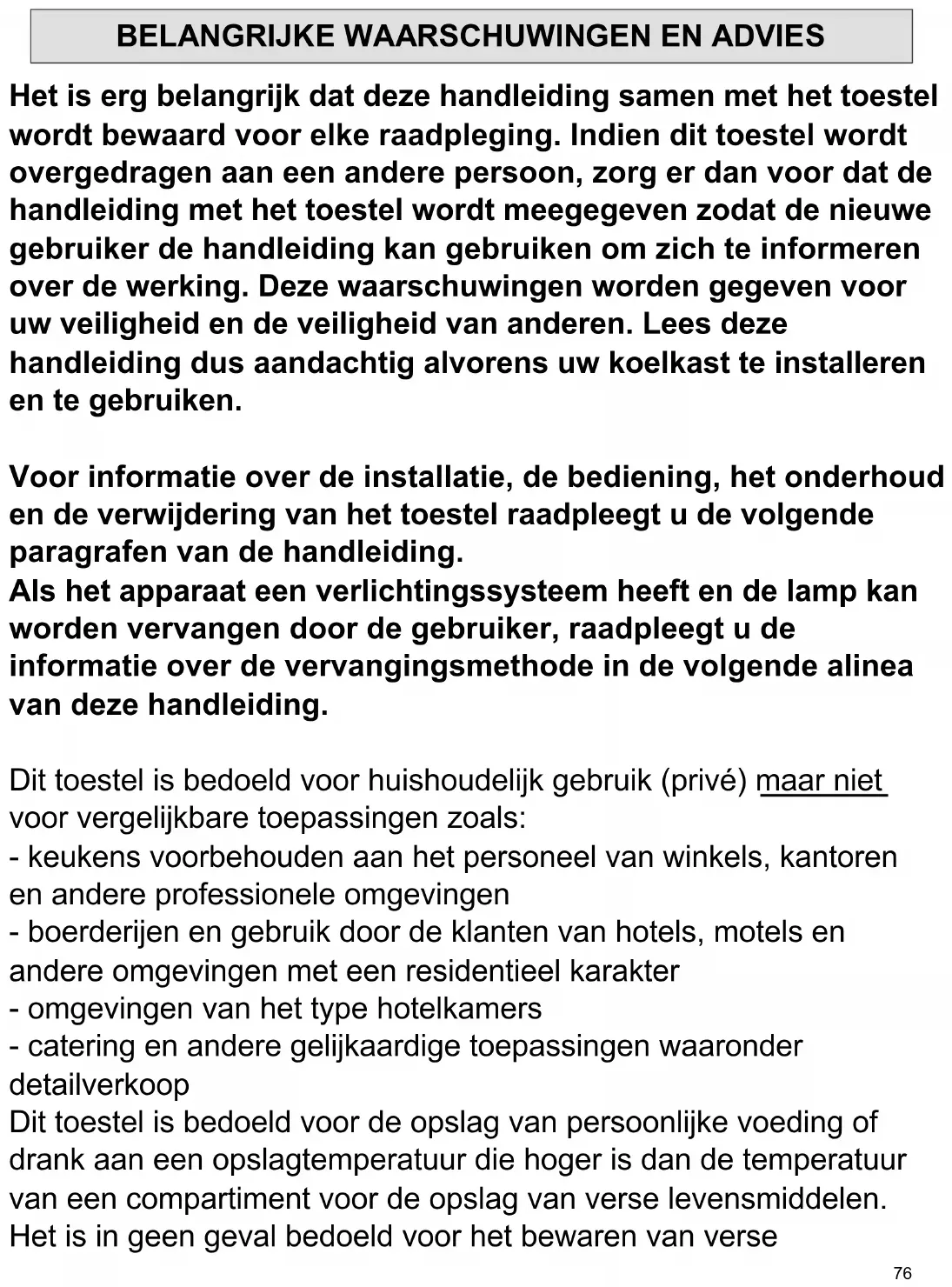 Het is erg belangrijk dat deze handleiding samen met het toestel wordt bewaard voor elke raadpleging. Indien dit toestel wordt overgedragen aan een andere persoon, zorg er dan voor dat de handleiding met het toestel wordt meegegeven zodat de nieuwe gebruiker de handleiding kan gebruiken om zich te informeren over de werking. Deze waarschuwingen worden gegeven voor uw veiligheid en de veiligheid van anderen. Lees deze handleiding dus aandachtig alvorens uw koelkast te installeren en te gebruiken. Voor informatie over de installatie, de bediening, het onderhoud en de verwijdering van het toestel raadpleegt u de volgende paragrafen van de handleiding. Als het apparaat een verlichtingssysteem heeft en de lamp kan worden vervangen door de gebruiker, raadpleegt u de informatie over de vervangingsmethode in de volgende alinea van deze handleiding. Dit toestel is bedoeld voor huishoudelijk gebruik (privé) maar niet voor vergelijkbare toepassingen zoals: - keukens voorbehouden aan het personeel van winkels, kantoren en andere professionele omgevingen - boerderijen en gebruik door de klanten van hotels, motels en andere omgevingen met een residentieel karakter - omgevingen van het type hotelkamers - catering en andere gelijkaardige toepassingen waaronder detailverkoop Dit toestel is bedoeld voor de opslag van persoonlijke voeding of drank aan een opslagtemperatuur die hoger is dan de temperatuur van een compartiment voor de opslag van verse levensmiddelen. Het is in geen geval bedoeld voor het bewaren van verse