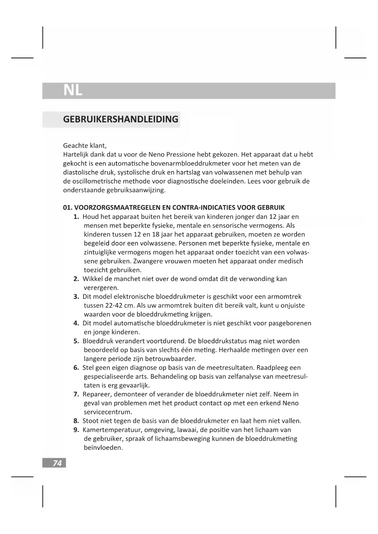 GEBRUIKERSHANDLEIDING Geachte klant, Hartelijk dank dat u voor de Neno Pressione hebt gekozen. Het apparaat dat u hebt gekocht is een automasche bovenarmbloeddrukmeter voor het meten van de diastolische druk, systolische druk en hartslag van volwassenen met behulp van de oscillometrische methode voor diagnossche doeleinden. Lees voor gebruik de onderstaande gebruiksaanwijzing.