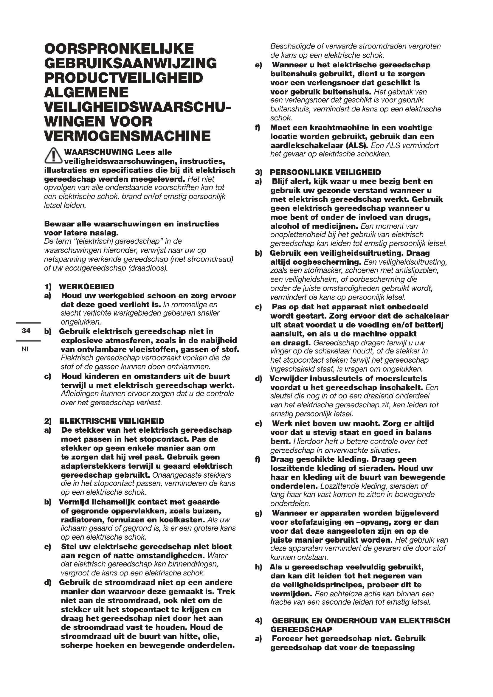 OORSPRONKELIJKE GEBRUIKSAANWIJZING PRODUCTVEILIGHEID ALGEMENE VEILIGHEIDSWAARSCHU- WINGEN VOOR VERMOGENSMACHINE WAARSCHUWING Lees alle veiligheidswaarschuwingen, instructies, illustraties en specificaties die bij dit elektrisch gereedschap werden meegeleverd. Het niet opvolgen van alle onderstaande voorschriften kan tot een elektrische schok, brand en/of ernstig persoonlijk letsel leiden. Bewaar alle waarschuwingen en instructies voor latere naslag. De term “(elektrisch) gereedschap” in de waarschuwingen hieronder, verwijst naar uw op netspanning werkende gereedschap (met stroomdraad) of uw accugereedschap (draadloos).