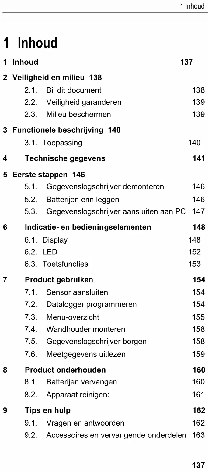 1 Inhoud 1 Inhoud 137 2 Veiligheid en milieu 138 2.1. Bij dit document 138 2.2. Veiligheid garanderen 139 2.3. Milieu beschermen 139 3 Functionele beschrijving 140 3.1. Toepassing 140 4 Technische gegevens 141 5 Eerste stappen 146 5.1. Gegevenslogschrijver demonteren 146 5.2. Batterijen erin leggen 146 5.3. Gegevenslogschrijver aansluiten aan PC 147 6 Indicatie- en bedieningselementen 148 6.1. Display 148 6.2. LED 152 6.3. Toetsfuncties 153 7 Product gebruiken 154 7.1. Sensor aansluiten 154 7.2. Datalogger programmeren 154 7.3. Menu-overzicht 155 7.4. Wandhouder monteren 158 7.5. Gegevenslogschrijver borgen 158 7.6. Meetgegevens uitlezen 159 8 Product onderhouden 160 8.1. Batterijen vervangen 160 8.2. Apparaat reinigen: 161 9 Tips en hulp 162 9.1. Vragen en antwoorden 162 9.2. Accessoires en vervangende onderdelen 1632 Veiligheid en milieu