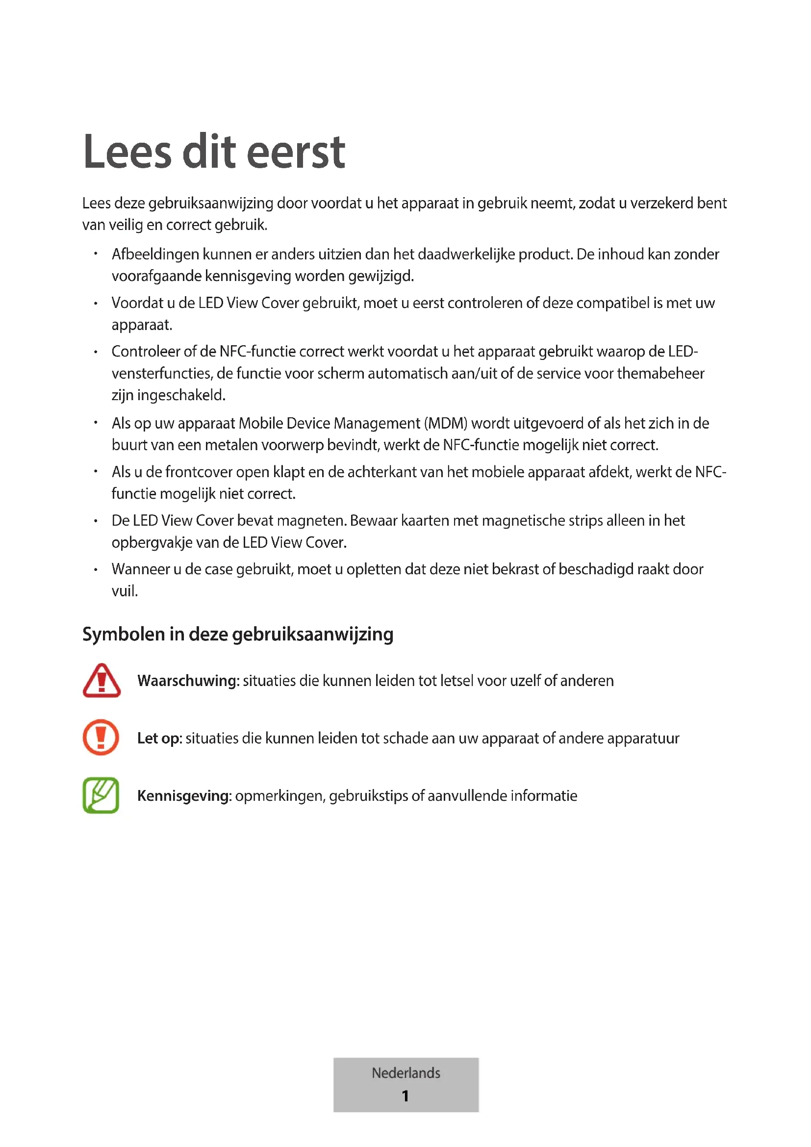Accessoires en gebruik vervolgens de editor-functie voor LED-pictogrammen. U kunt ook de editor-app voor LED-pictogrammen gebruiken die wordt weergegeven wanneer u de LED View Cover bevestigt aan het mobiele apparaat. Nederlands 5Drukfouten voorbehouden. Copyright Copyright © 2020 Samsung Electronics Deze gebruiksaanwijzing is beschermd onder internationale auteursrechtwetten. Geen enkel onderdeel van deze gebruiksaanwijzing mag worden gereproduceerd, gedistribueerd, vertaald of verzonden in welke vorm dan ook of op welke elektronische of mechanische wijze dan ook, inclusief door deze te fotokopiëren, op te nemen of op te slaan in een systeem voor het opslaan en ophalen van informatie. Handelsmerken