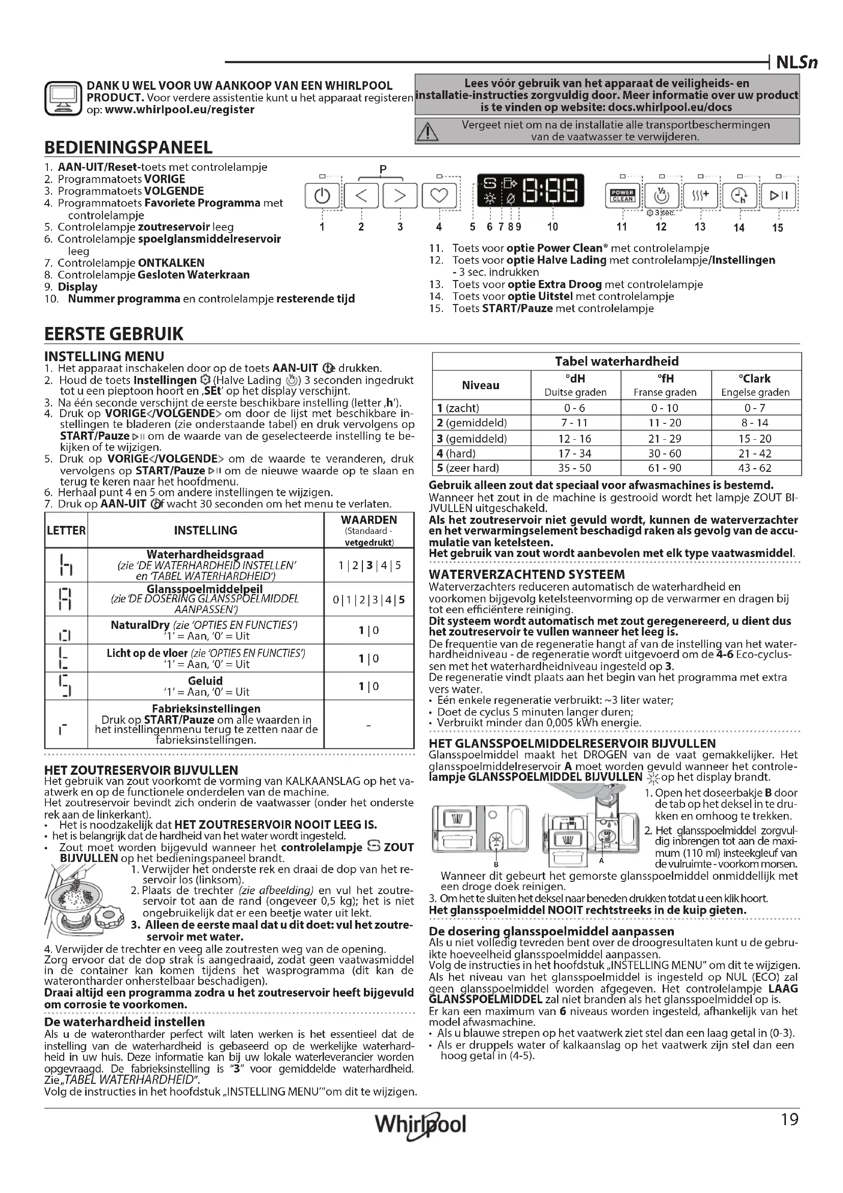 DANK U WEL VOOR UW AANKOOP VAN EEN WHIRLPOOL PRODUCT. Voor verdere assistentie kunt u het apparaat registeren op: www.whirlpool.eu/register EERSTE GEBRUIK Lees vóór gebruik van het apparaat de veiligheids- en installatie-instructies zorgvuldig door. Meer informatie over uw product is te vinden op website: docs.whirlpool.eu/docs Vergeet niet om na de installatie alle transportbeschermingen van de vaatwasser te verwijderen. INSTELLING MENU