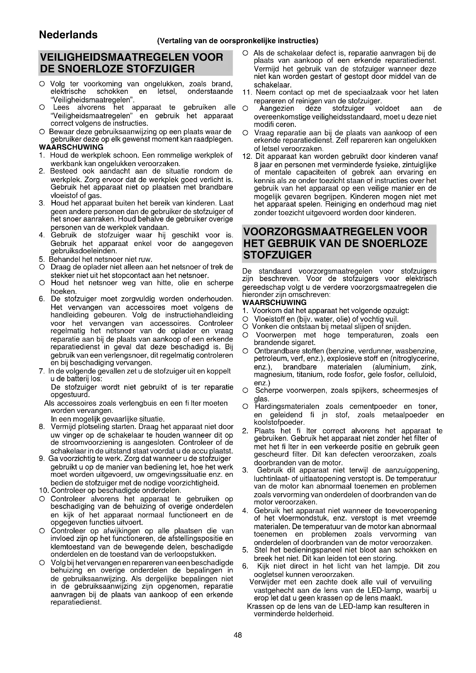 geen andere personen dan de gebruiker de stofzuiger of het snoer aanraken. Houd behalve de gebruiker overige personen van de werkplek vandaan.