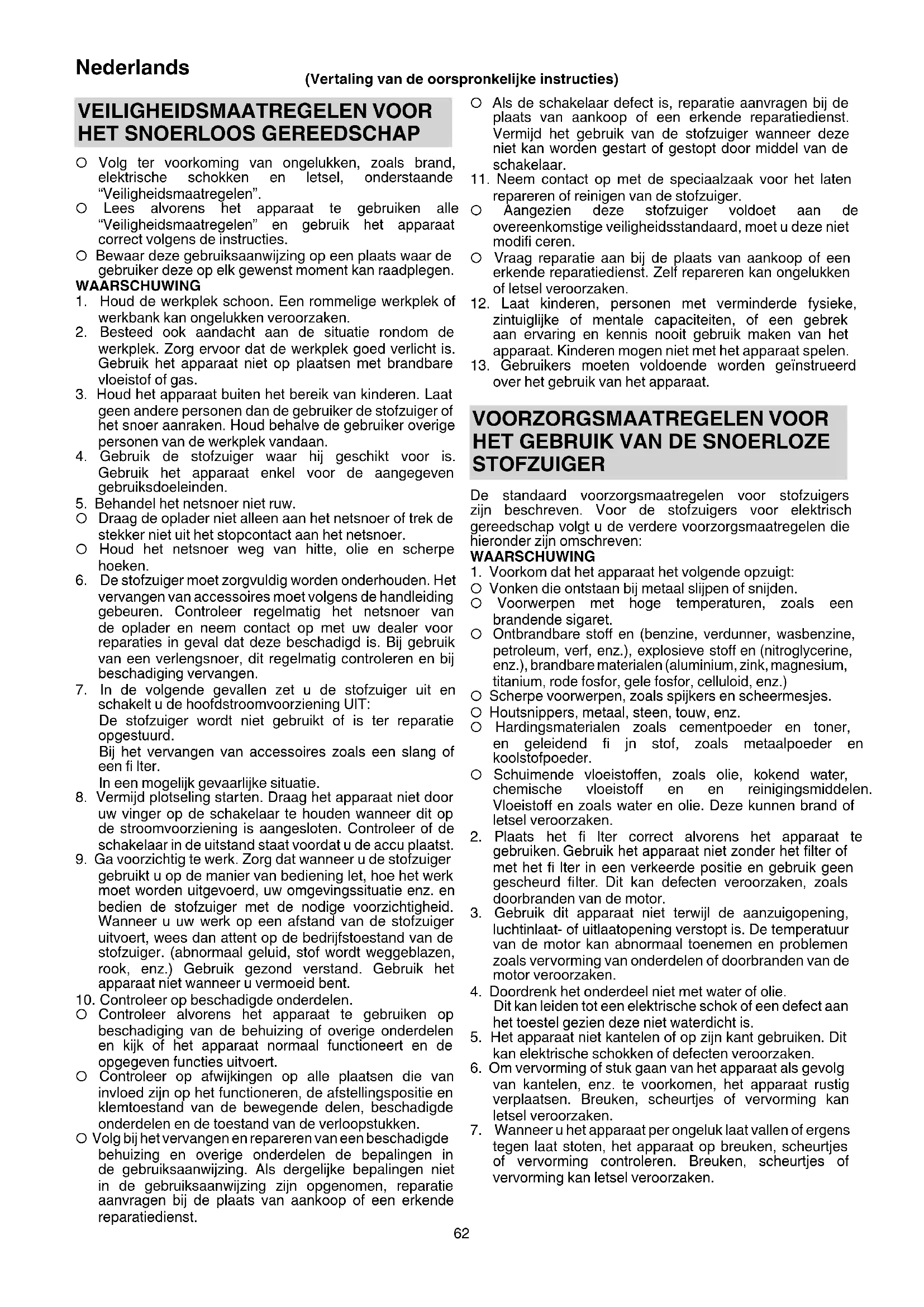 STOFZUIGER De standaard voorzorgsmaatregelen voor stofzuigers zijn beschreven. Voor de stofzuigers voor elektrisch gereedschap volgt u de verdere voorzorgsmaatregelen die hieronder zijn omschreven: WAARSCHUWING