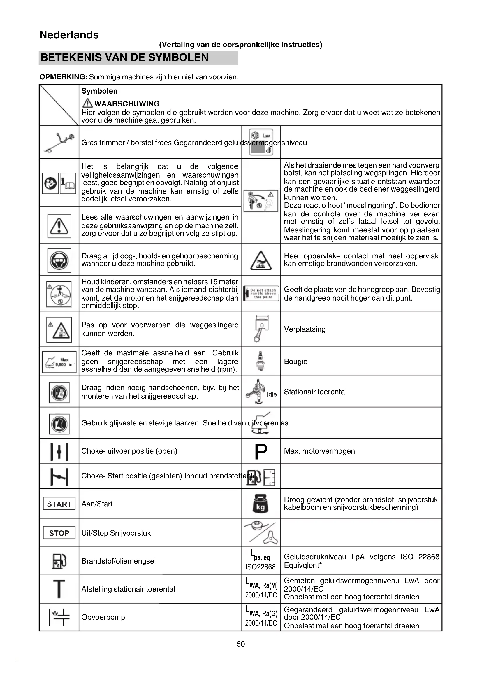 OPMERKING: Sommige machines zijn hier niet van voorzien. Symbolen WAARSCHUWING Hier volgen de symbolen die gebruikt worden voor deze machine. Zorg ervoor dat u weet wat ze betekenen voor u de machine gaat gebruiken. Gras trimmer / borstel frees Gegarandeerd geluidsvermogensniveau Het is belangrijk dat u de volgende veiligheidsaanwijzingen en waarschuwingen leest, goed begrijpt en opvolgt. Nalatig of onjuist gebruik van de machine kan ernstig of zelfs dodelijk letsel veroorzaken. Als het draaiende mes tegen een hard voorwerp botst, kan het plotseling wegspringen. Hierdoor kan een gevaarlijke situatie ontstaan waardoor de machine en ook de bediener weggeslingerd kunnen worden. Deze reactie heet “messlingering”. De bediener kan de controle over de machine verliezen met ernstig of zelfs fataal letsel tot gevolg. Messlingering komt meestal voor op plaatsen waar het te snijden materiaal moeilijk te zien is. Lees alle waarschuwingen en aanwijzingen in deze gebruiksaanwijzing en op de machine zelf, zorg ervoor dat u ze begrijpt en volg ze stipt op. Draag altijd oog-, hoofd- en gehoorbescherming wanneer u deze machine gebruikt. Heet oppervlak– contact met heel oppervlak kan ernstige brandwonden veroorzaken. Houd kinderen, omstanders en helpers 15 meter van de machine vandaan. Als iemand dichterbij komt, zet de motor en het snijgereedschap dan onmiddellijk stop. Geeft de plaats van de handgreep aan. Bevestig de handgreep nooit hoger dan dit punt. Pas op voor voorwerpen die weggeslingerd kunnen worden. Verplaatsing min